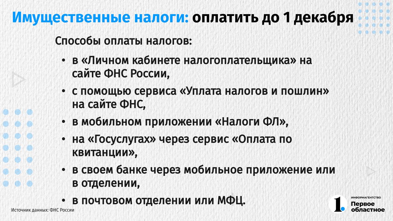 В Челябинской области жители начали получать уведомления для оплаты налогов на имущество. Сообщения появляются на портале госуслуг и в личном кабинете налогоплательщика на сайте ФНС, рассылаются «Почтой России». Теперь все имущественные налоги объединены в единый налоговый платеж. Внести сумму за 2022 год нужно до 1 декабря 2023-го. ИА «Первое областное» рассказывает, как нужно платить налоги по новым правилам.