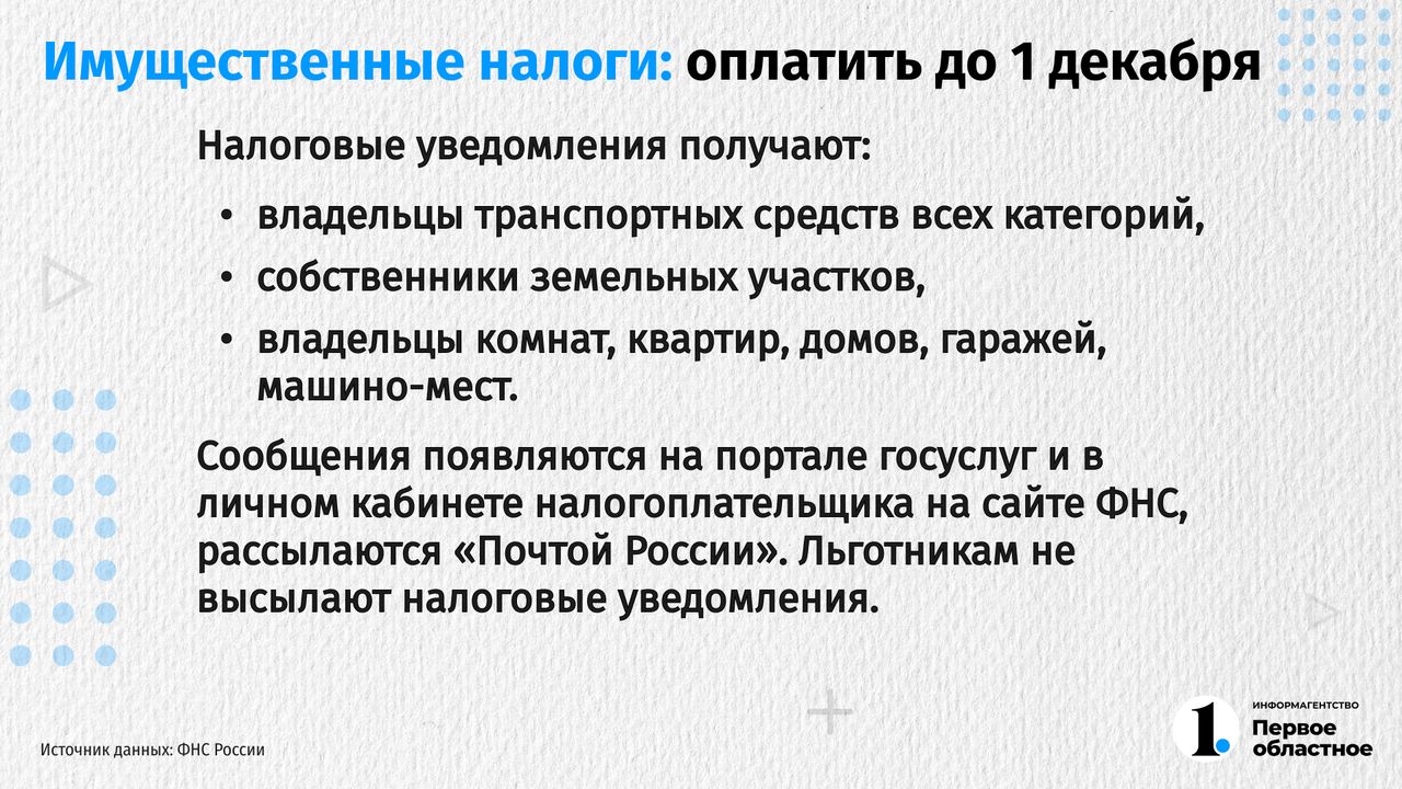 В Челябинской области жители начали получать уведомления для оплаты налогов на имущество. Сообщения появляются на портале госуслуг и в личном кабинете налогоплательщика на сайте ФНС, рассылаются «Почтой России». Теперь все имущественные налоги объединены в единый налоговый платеж. Внести сумму за 2022 год нужно до 1 декабря 2023-го. ИА «Первое областное» рассказывает, как нужно платить налоги по новым правилам.