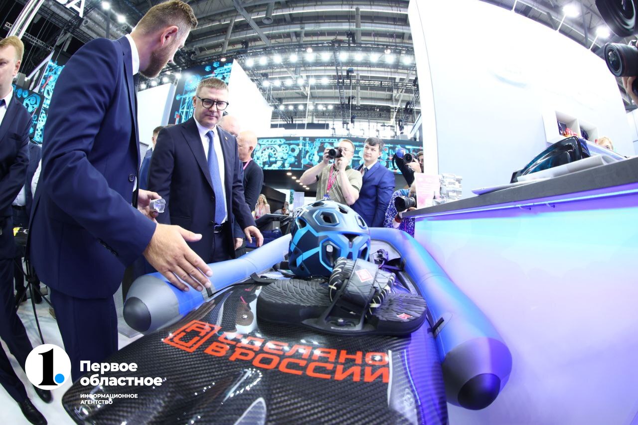 Алексей Текслер оценил разработку Группы компаний «Метран», представившей на «Иннопроме-2024» компактное персональное плавательное средство «Мотосерф», обеспечивающее транспортировку человека со скоростью 50 километров в час с запасом хода в среднем 50 минут. Также сотрудники предприятия познакомили главу региона с работой прототипа турбореактивного двигателя.