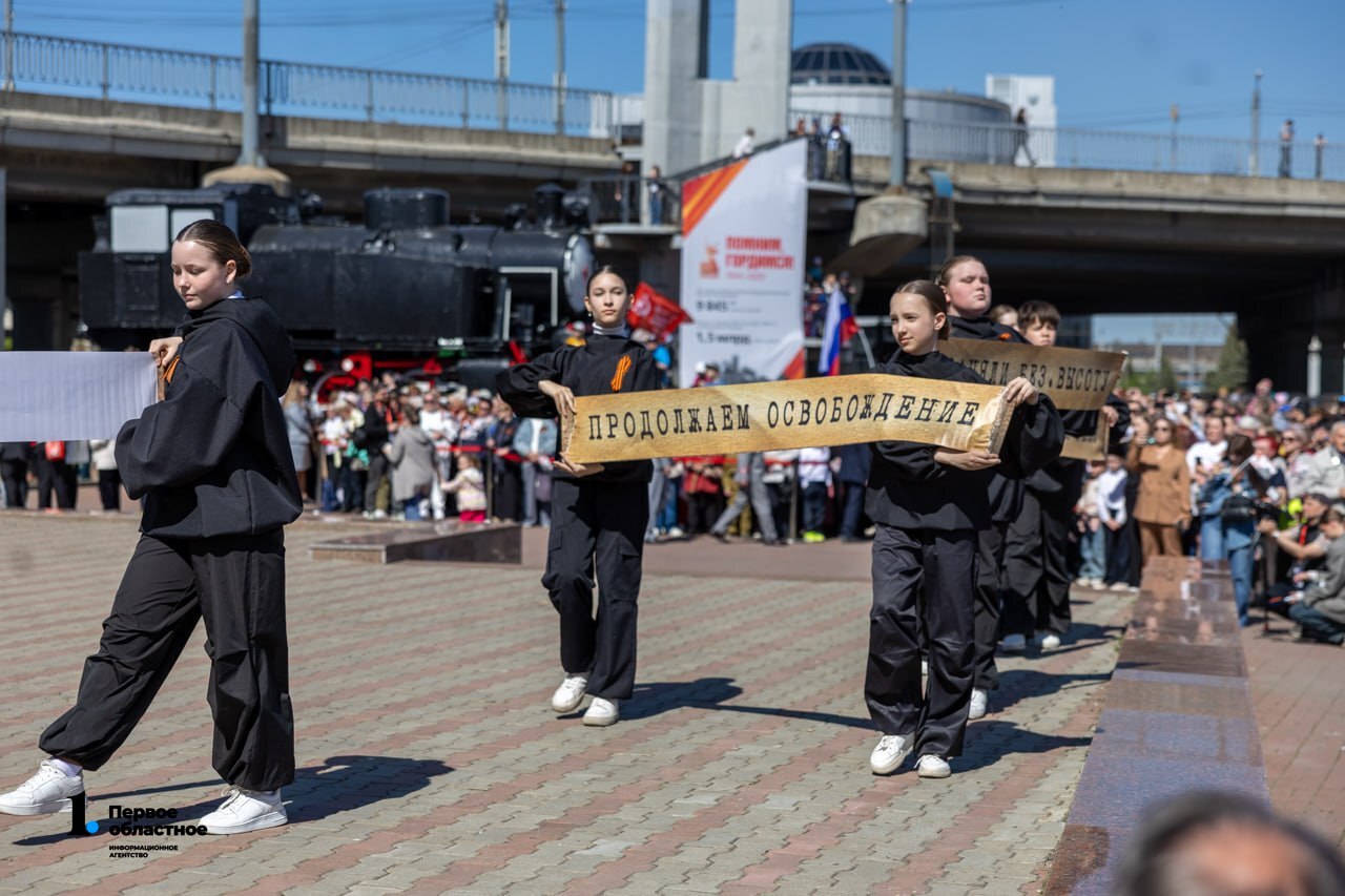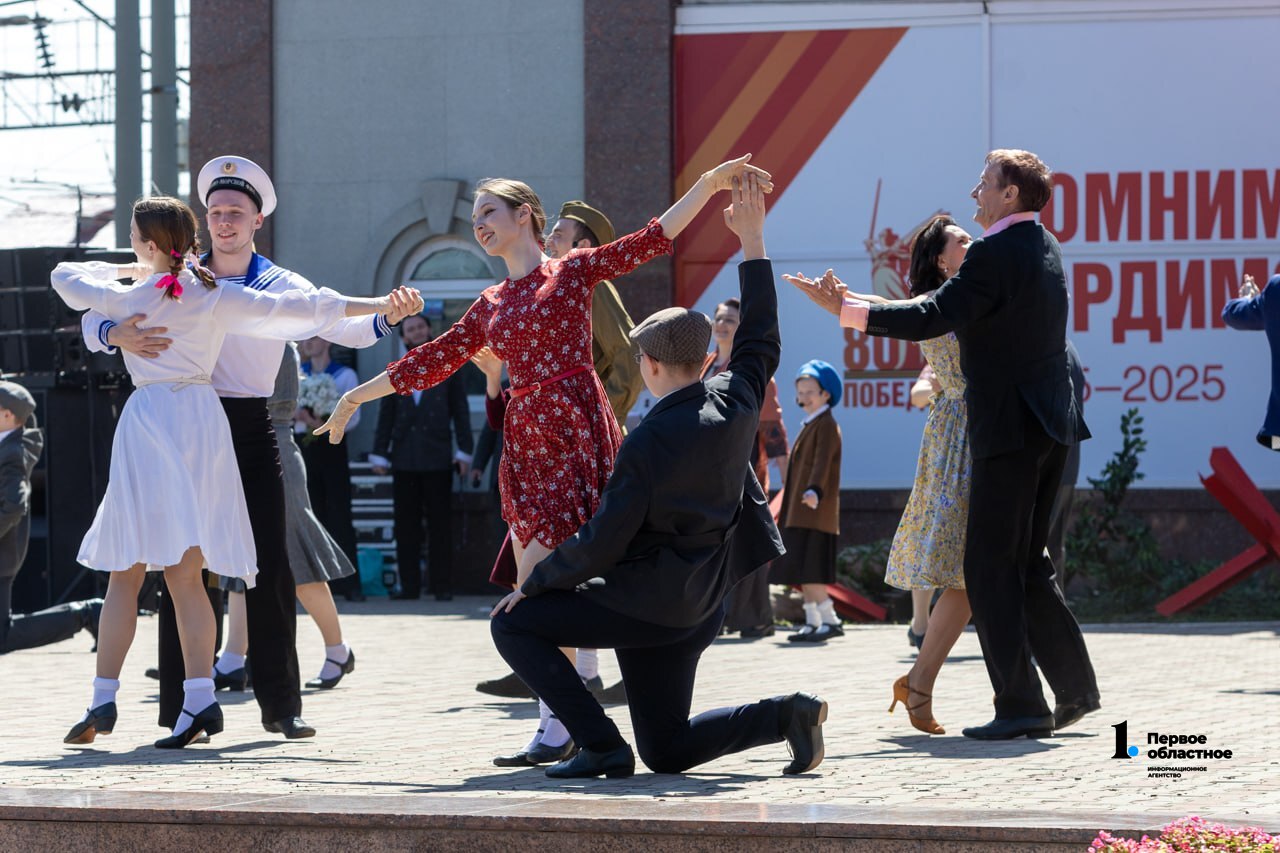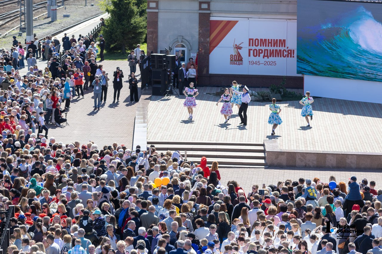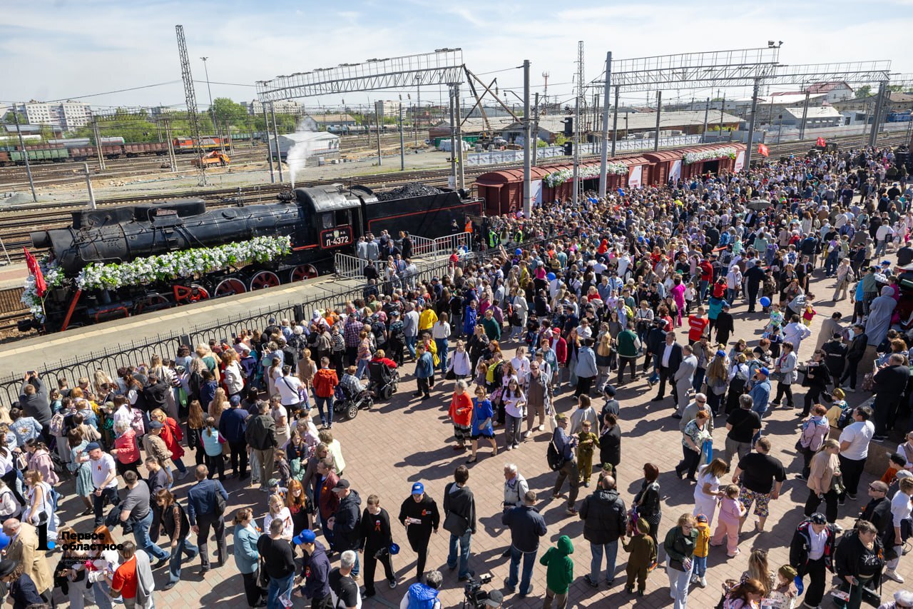Звуки паровозного гудка и радостные возгласы толпы воссоздали победную атмосферу 1945 года. Жители города тепло приветствовали ретропоезд объятиями, песнями и танцами.
