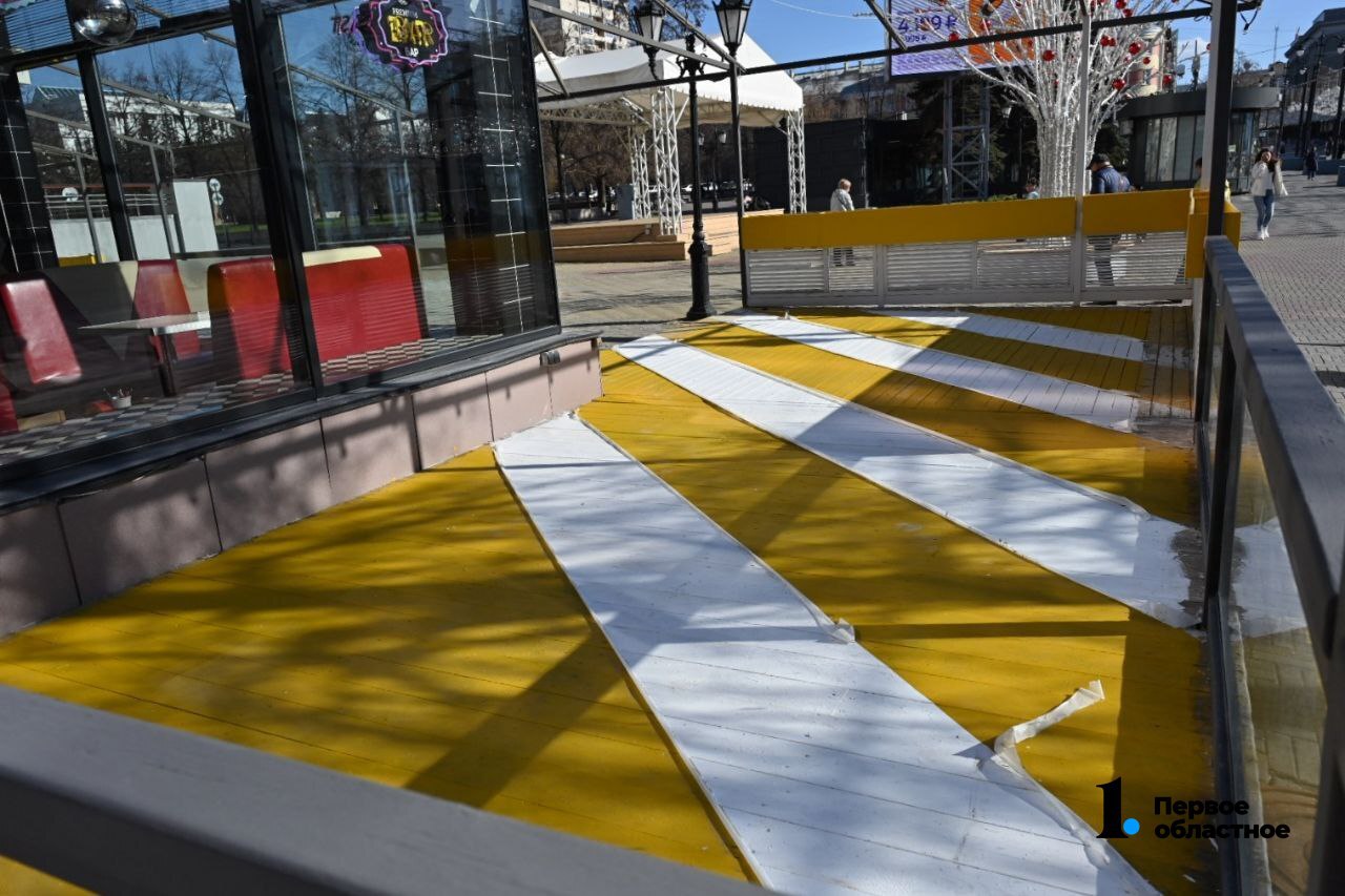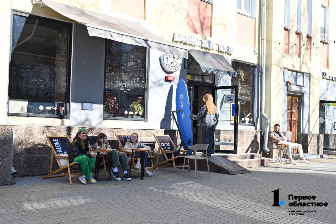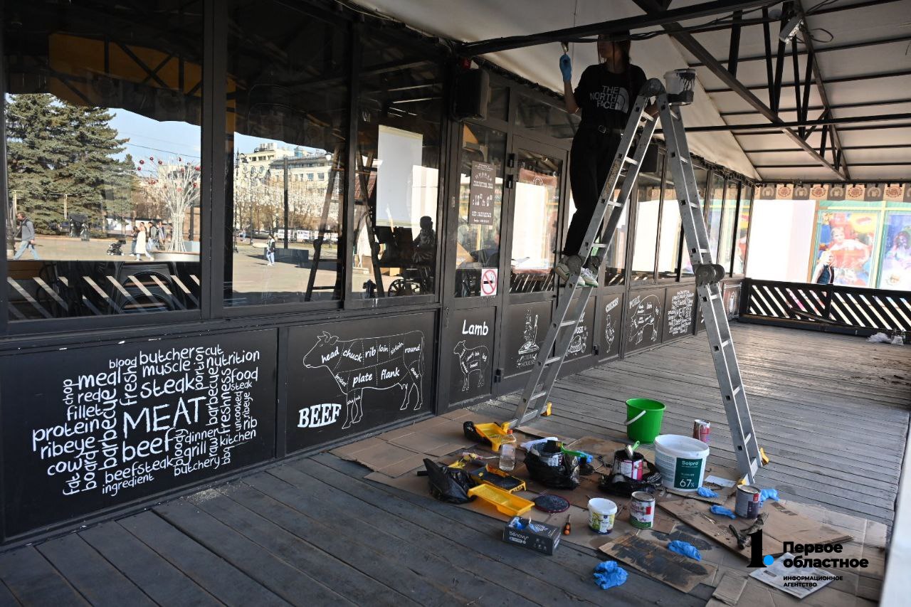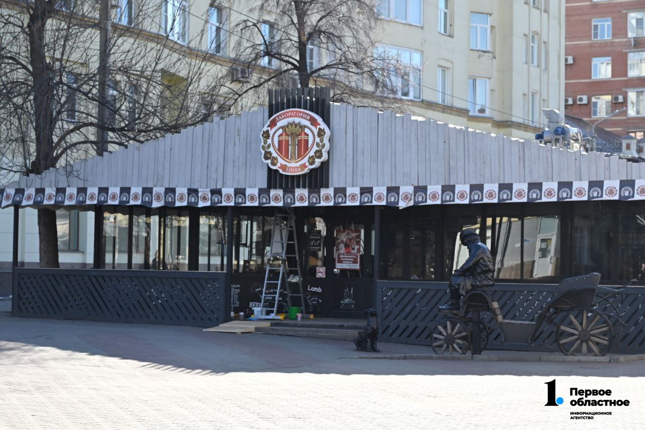 Корреспондент ИА «Первое областное» в среду прошел по пешеходной Кировке и обратил внимание, что практически все заведения общепита начали расчехлять летние веранды, мыть и монтировать летние столы, стулья и зонты.