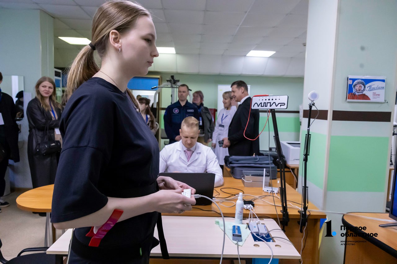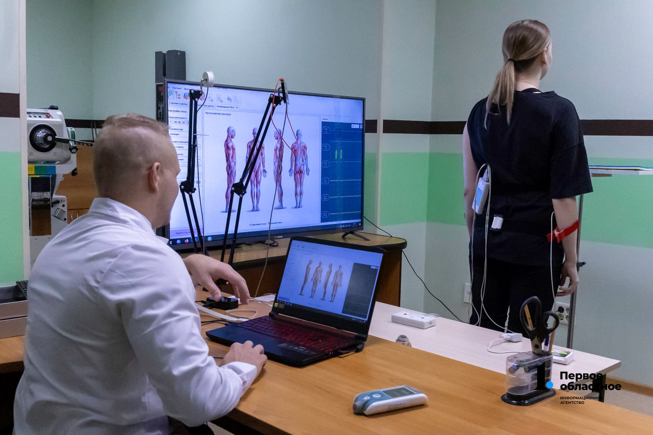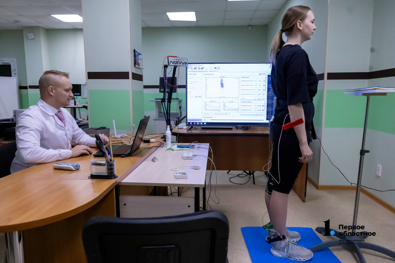 Вместе с Дмитрием Петелиным мы отправляемся в лабораторию спортивной медицины ЮУрГУ. Здесь проходит психофизиологическая оценка спортсменов, методика применяется и у космонавтов. Аспирант проводит оценку тонуса и жесткости мышц. На другом аппарате проводится заключение по компонентному составу тела — костей, мышц, жира по участкам тела.