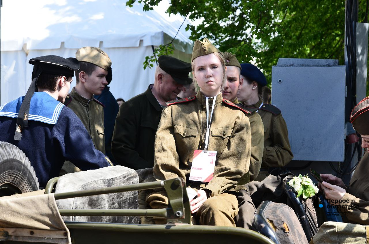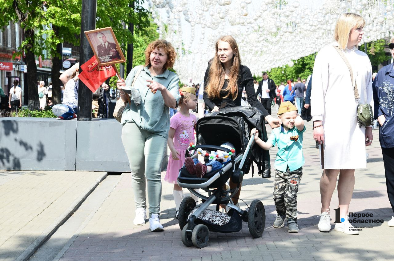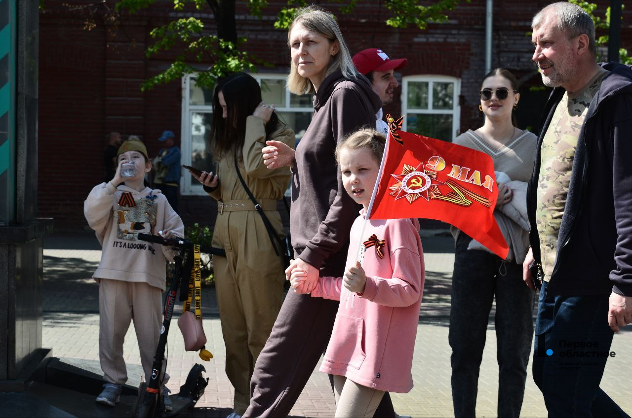 Челябинцы приходят на Кировку семьями. У многих на одежде — георгиевские ленты. Кто-то держит портрет своего ветерана.