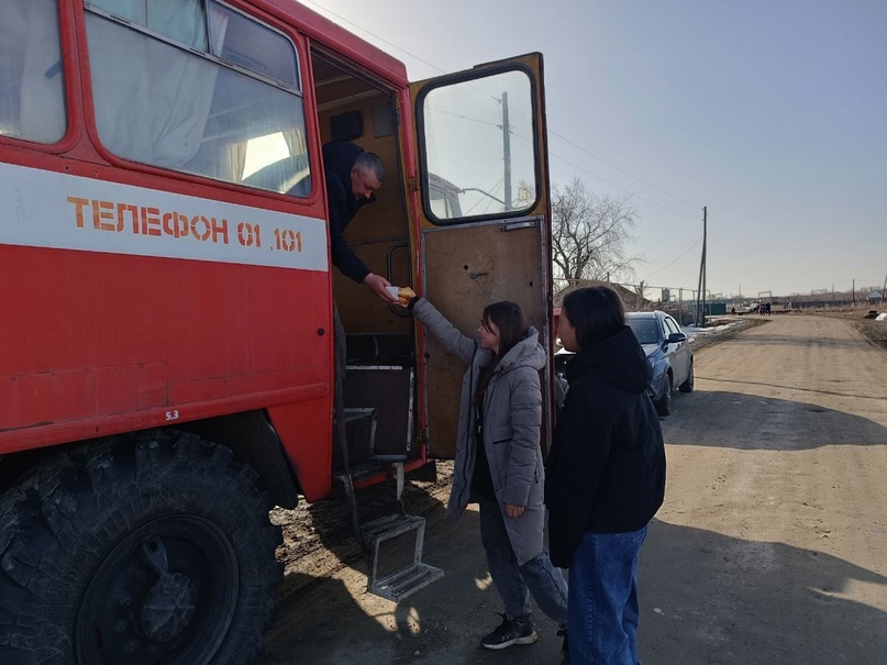 Жителей улицы угощают пирожками и чаем, а позже привезут горячий ужин. Машина — из Карталов, работают на ней спасатели 57-ПСЧ.