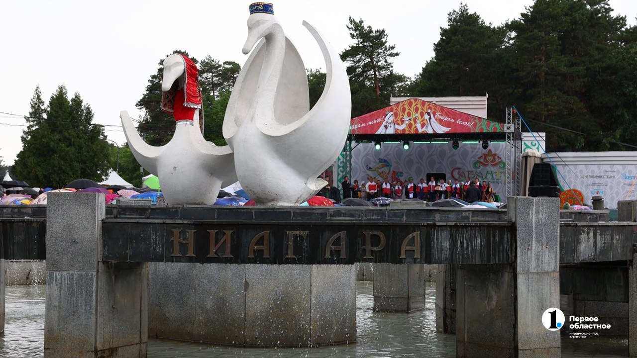 Парк Гагарина сегодня был пронизан теплом. Национальный колорит звучал во всем — даже каменные лебеди примерили головные уборы башкир и татар.