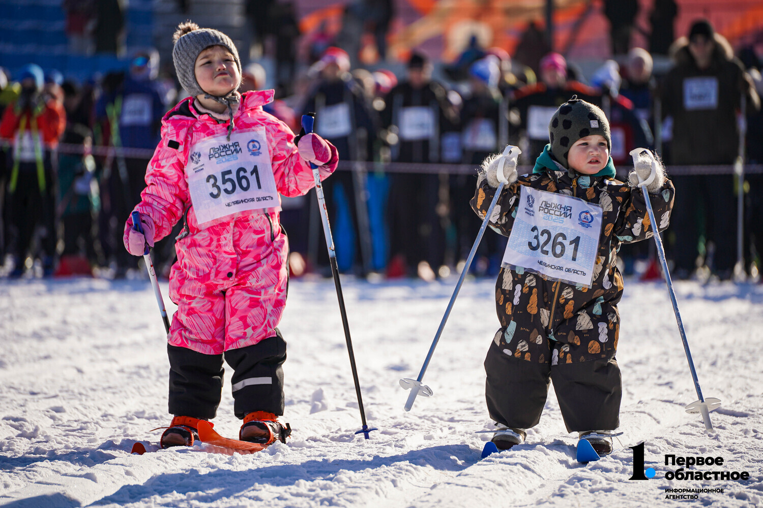 Радостные и довольные, с улыбками на лицах они дружно пробежали дистанцию. Но некоторые из них отстали. Вот эти два участника (а они, скорее всего, брат с сестрой) явно не спешили пересечь финишный створ. И кажется, были явно не в восторге от того, что на них надели лыжи.