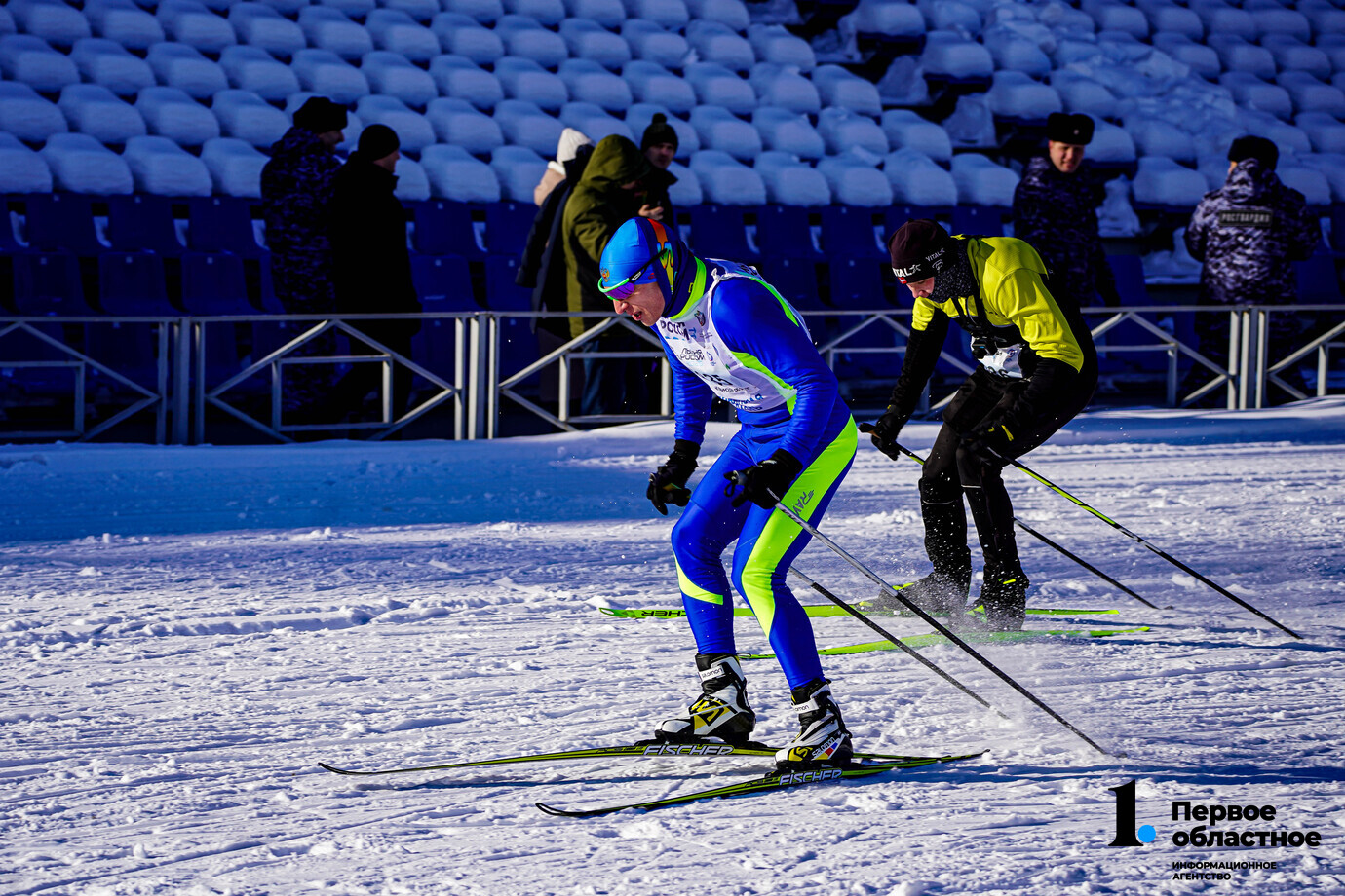 Не прошло и 13 минут, как на финишной прямой показались первые два участника. Судя по всему, они сами профессионально занимаются лыжными гонками — очень уж стремительно преодолели 200-метровую финишную прямую. Они еще и «зарубились» между собой за победу.