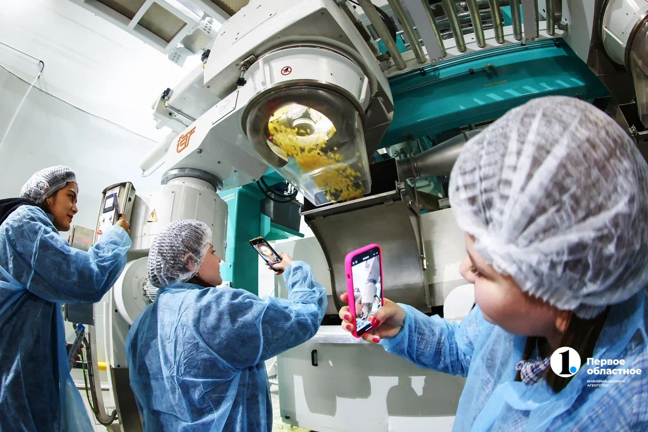 Студентам показали, с помощью чего продавливается тесто и получаются разные формы макарон, и представили всю продукцию предприятия — в том числе муку, разные крупы и хлопья.