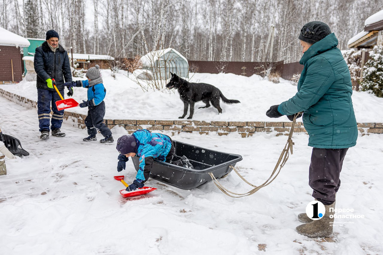 Он ведет внуков во двор. Там полно работы: накануне шел снег, пора браться за лопаты.