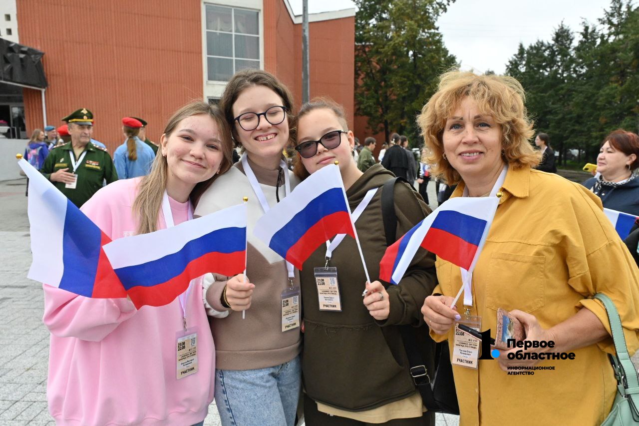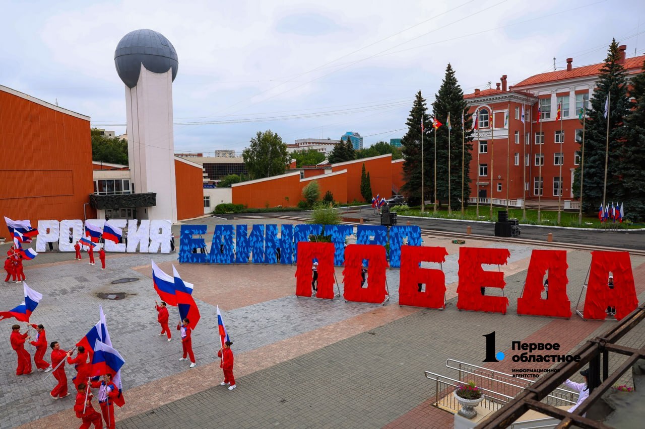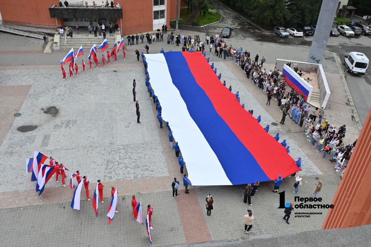 Главный символ государства — полотно триколора длиной 30 и шириной 9 метров — развернули у Дворца пионеров и школьников им. Н. К. Крупской, на площади Разведчиков.
