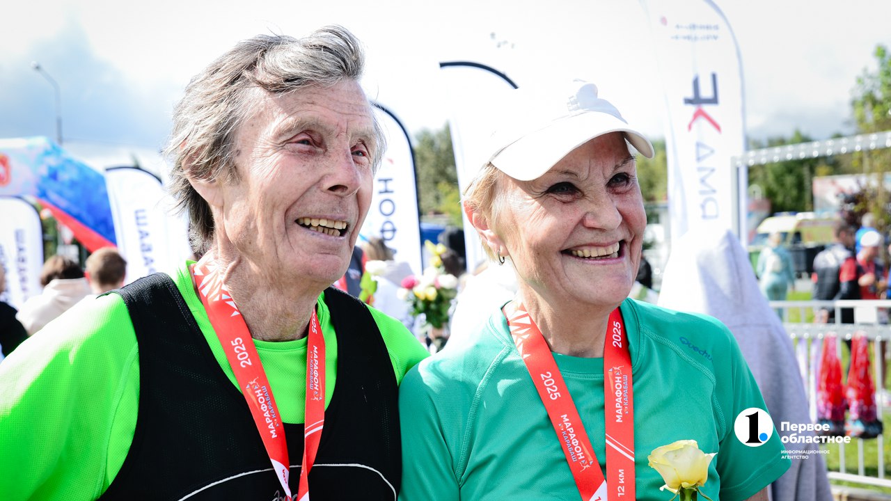 На трассе стираются границы между поколениями. И вот на финише встречаем Валентину Печалину, спустя минут 10 ее догоняет муж Дмитрий. Они живут в Южноуральске, бегают вместе больше полувека.
