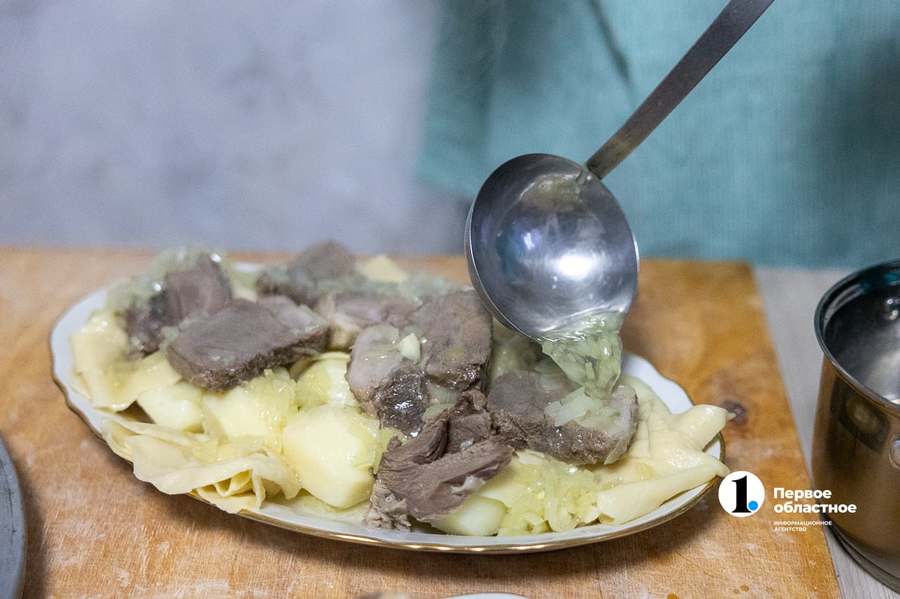 Мы наблюдаем, как на огромном подносе, доставшемся ей от бабушки («Может, он еще до нашей эры был!» — смеется она), собирается это величественное блюдо: вниз — ароматная лапша, затем картошка, сверху — мясо горкой, и все это щедро поливается шурпой с золотистым луком. Отдельно, в пиалах, — наваристый бульон.