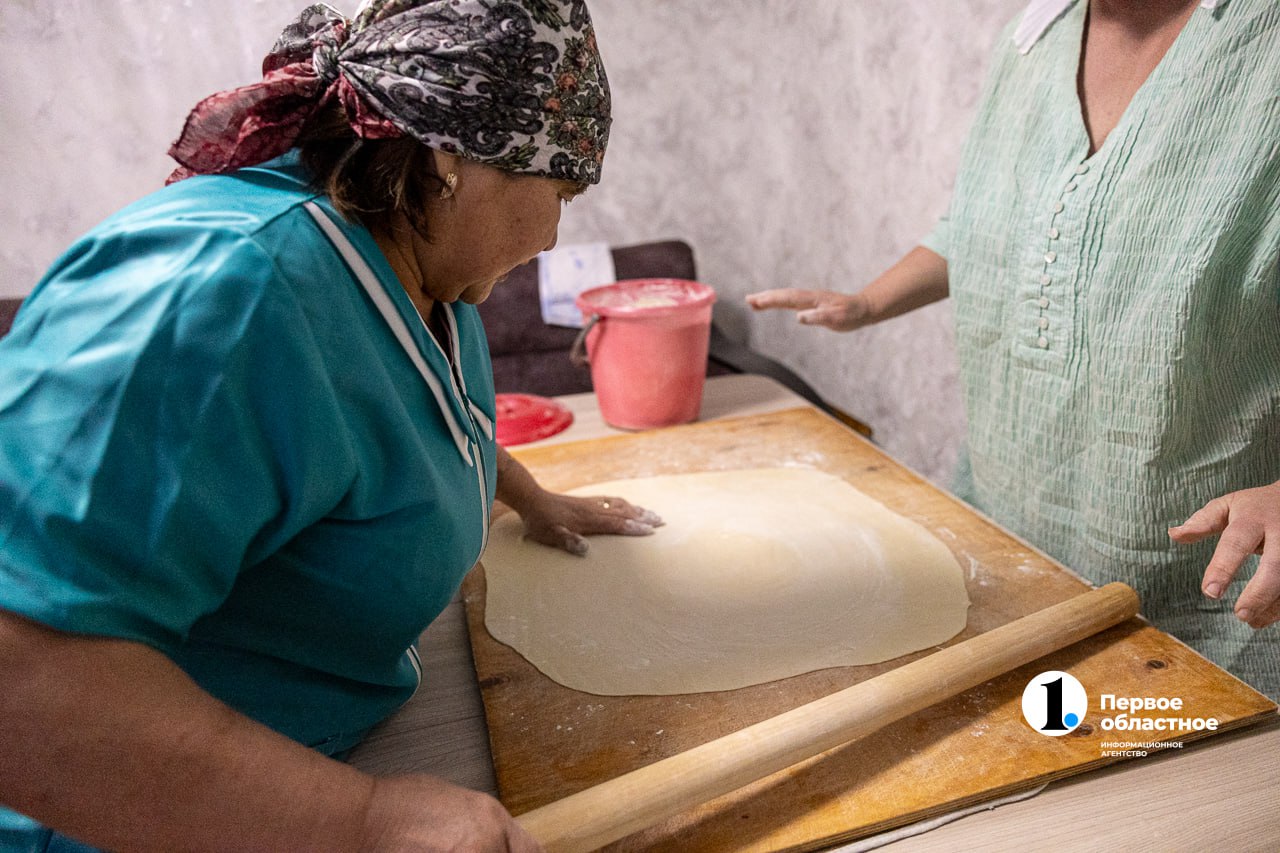 «Ничего, в первый раз и такая сойдет! Главное, чтобы от души было. Давайте-ка я покажу, как катать. Вот так, с этой стороны, а потом с другой. Чтоб тонко-тонко, в лист! Мукой чуть подсыпай, чтоб не прилипало, но знай меру — переборщишь, невкусно будет. Переворачивай смелее», — подбадривает Гульшида, ловко наматывая свое тесто на скалку.