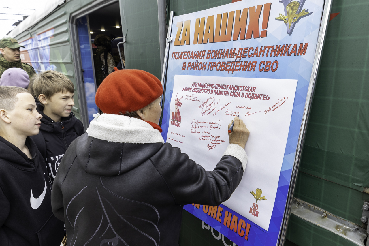 Также у поезда стоял стенд, где все желающие могли написать свои пожелания бойцам на СВО. В разных вариациях они все в итоге сводились к одному: «Мы ждем вас домой — с победой!».