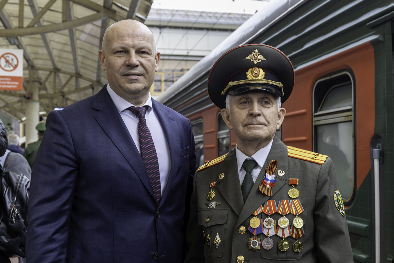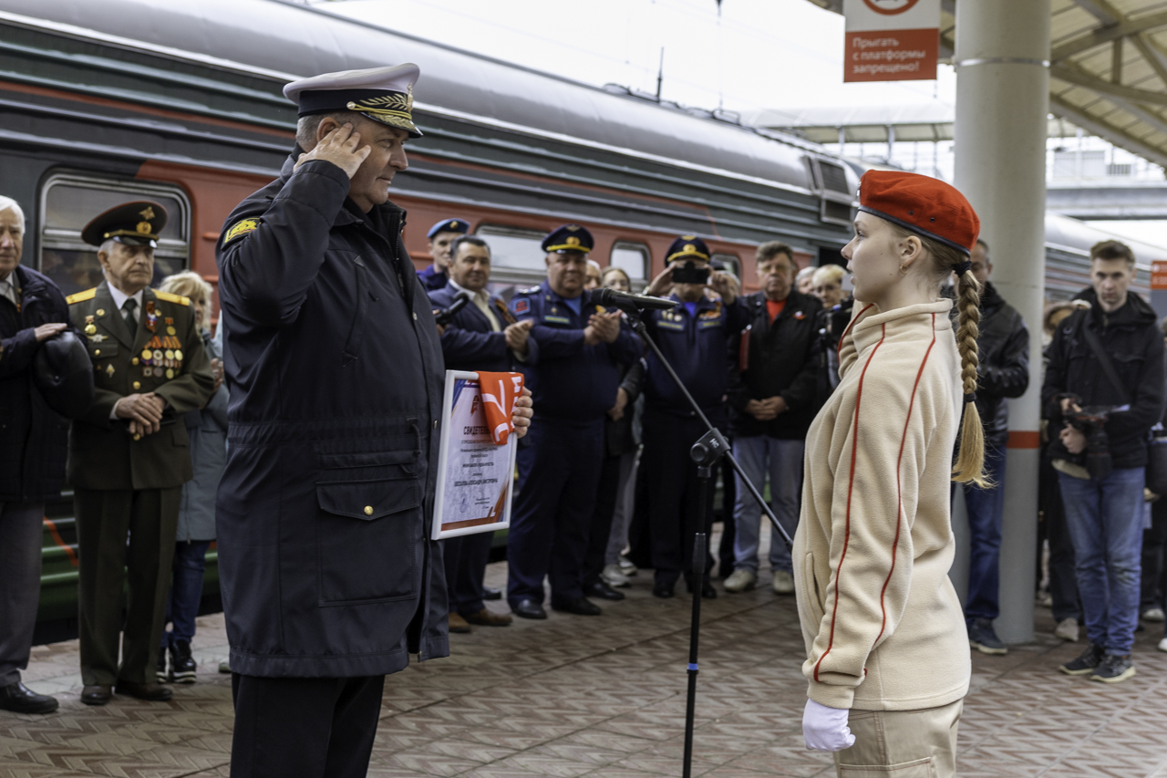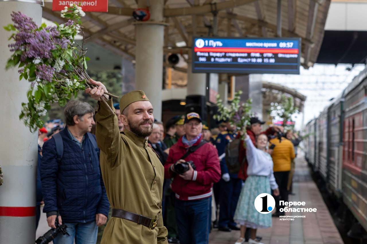 Восемь тематических вагонов, экспресс-экскурс в историю Великой Победы, а также и новейшую историю России и спецоперации, пятичасовая стоянка и — дальше, вглубь страны по Транссибирской магистрали. Сегодня, 14 мая, на станцию Челябинск-Главный прибыл уникальный агитационный поезд «Единство в памяти. Сила в подвиге». Встречали его военный оркестр, отряды юнармейцев и простые челябинцы, которые затем смогли свободно посетить передвижную выставку. О том, что там можно увидеть, задачах и внутреннем наполнении совместного проекта Минобороны и РЖД — фоторепортаж ИА «Первое областное».