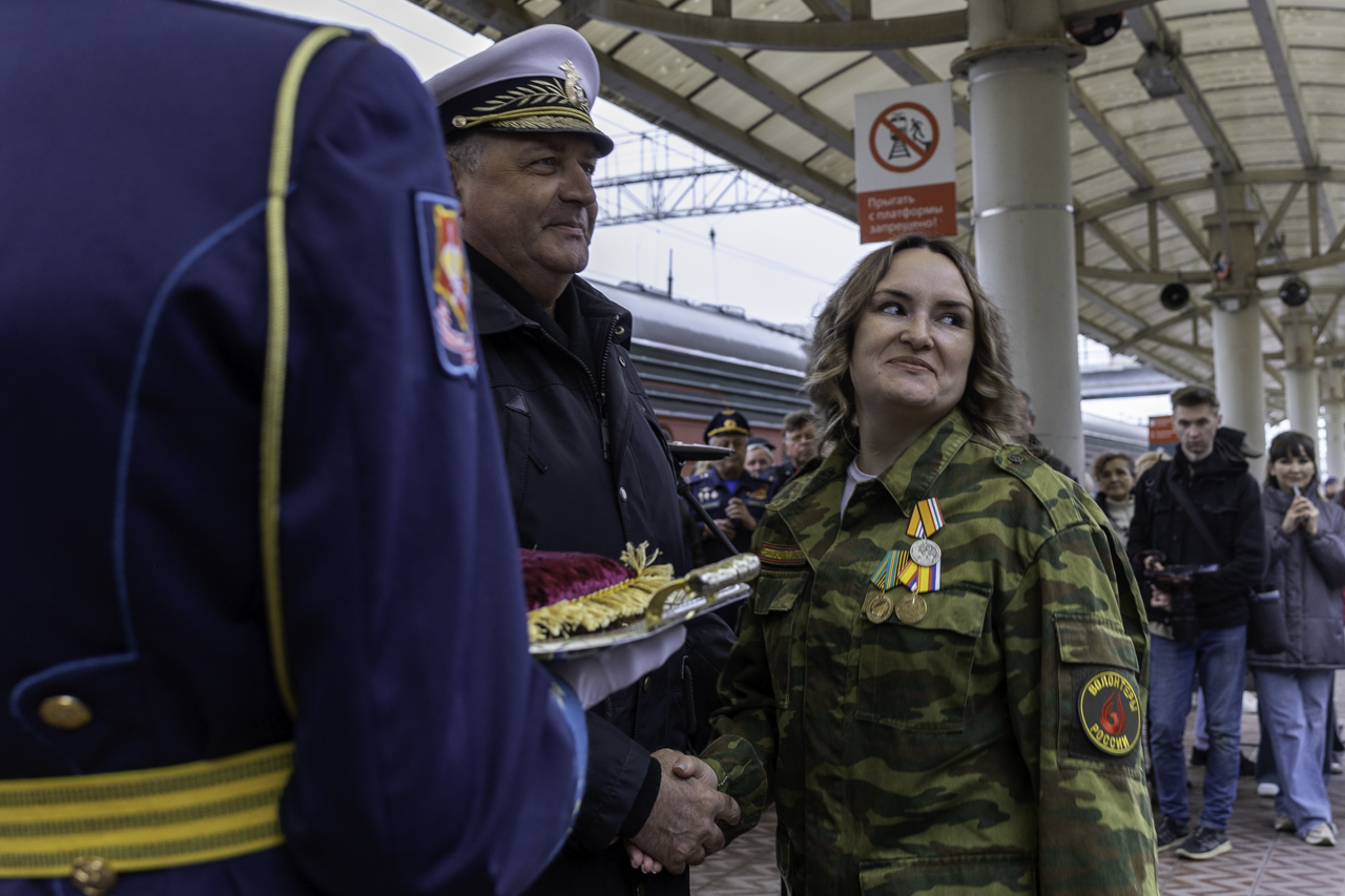 В каждом вагоне об экспозиции рассказывают действующие военнослужащие, участники специальной военной операции, имеющие боевые награды.