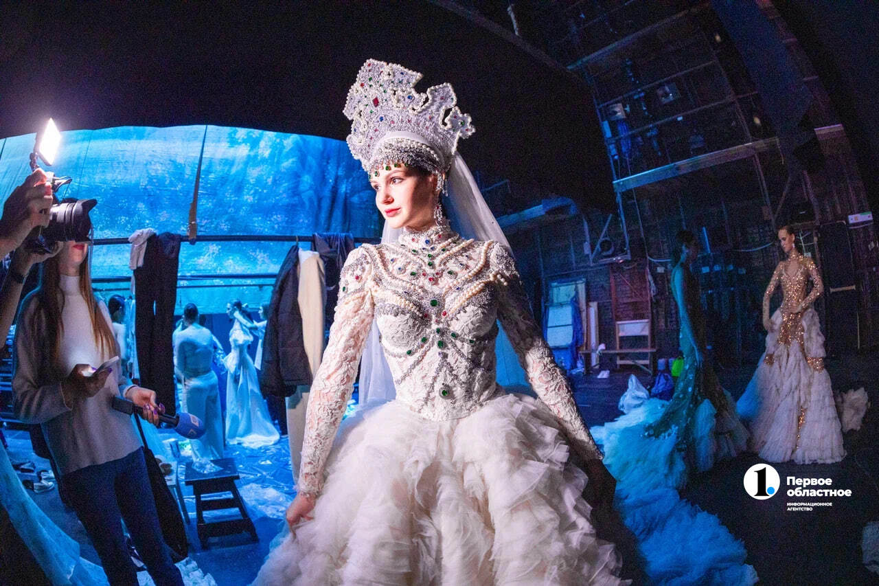 «Платье тяжеловатое, но самое тяжелое — это, конечно, кокошник, он весит около 4 килограммов. Я очень волнуюсь перед выходом, но знаю, что справлюсь!» — делится модель Камилла, примерившая образ Царевны Лебеди.
