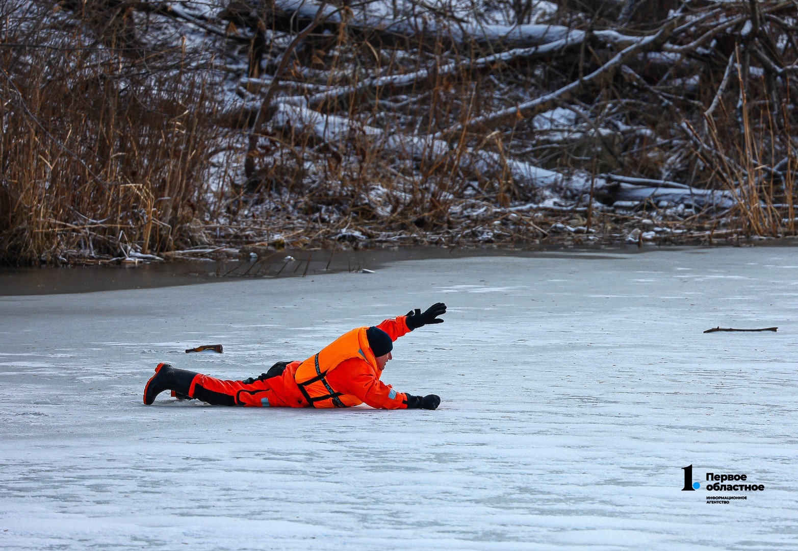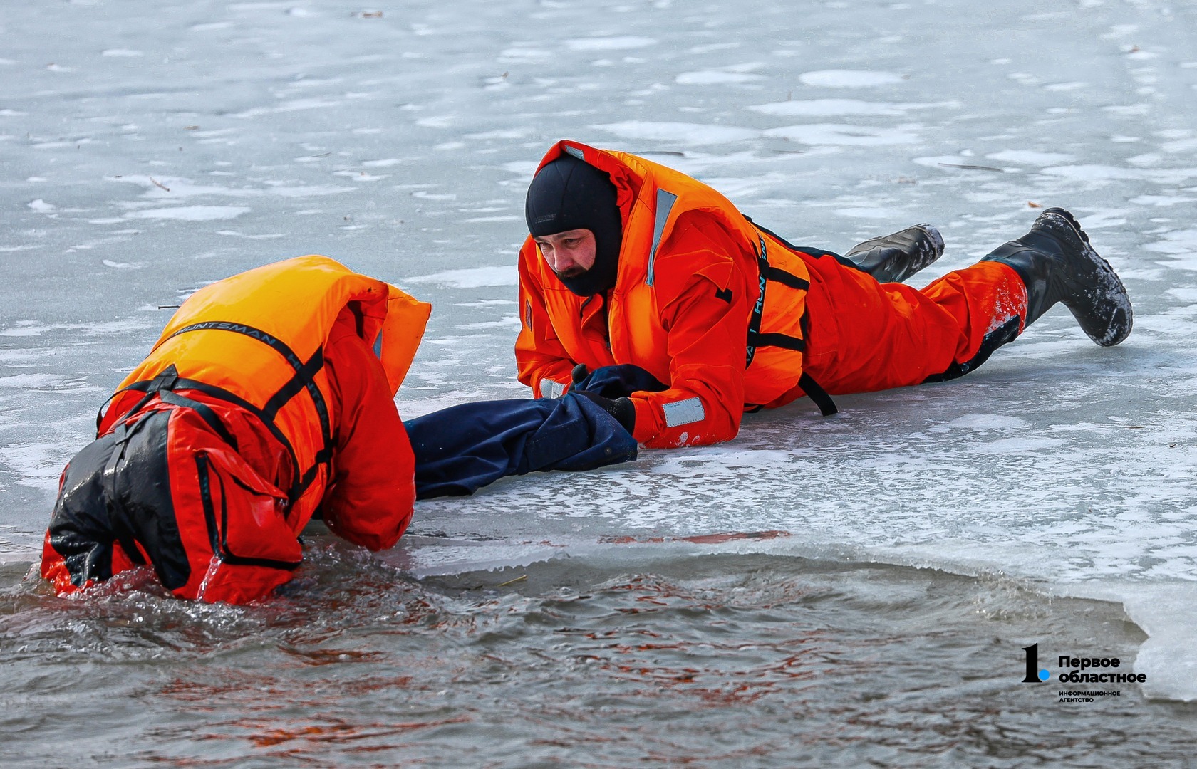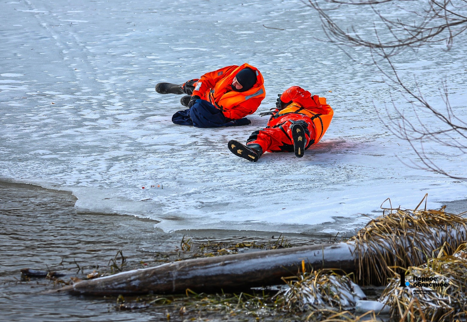 Роль утопающих исполнили сотрудники Поисково-спасательной службы на водных объектах. В теплых костюмах, они пробирались на тонкий лед.