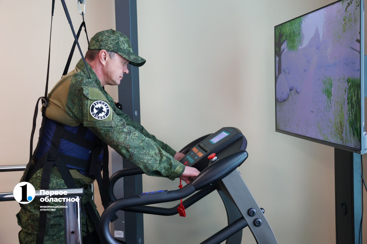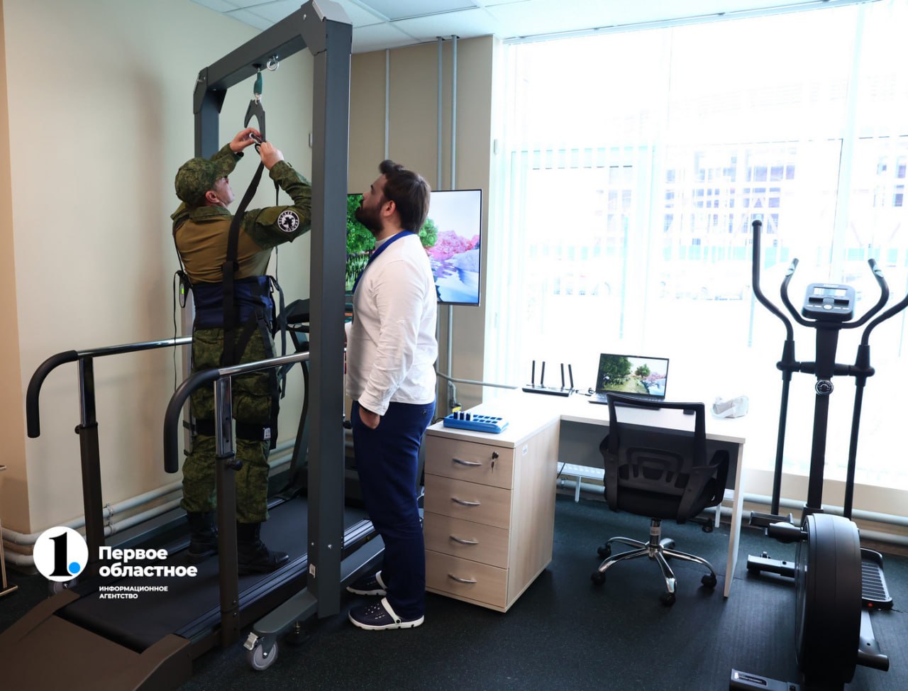 «В тренажерном зале представлено несколько зон: реабилитации, адаптивной физкультуры, силовых и кардионагрузок. В зоне реабилитации есть тренажер ходьбы, который позволяет вернуть навыки передвижения. Пациент подвешивается на модуле разгрузки веса, при помощи беговой дорожки мы имитируем функцию ходьбы, а при помощи датчиков считываем мышцы, которые не включены, и стимулируем их небольшими разрядами тока. За счет этого происходит реабилитация бойца. Пациент не сразу начинает бежать, но потихоньку восстанавливает все функции», — рассказывает инструктор по лечебной физкультуре Антон Жуков.