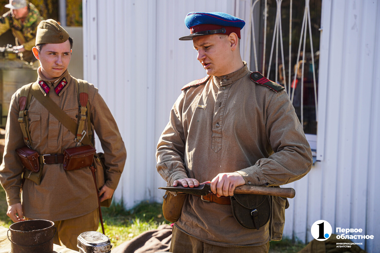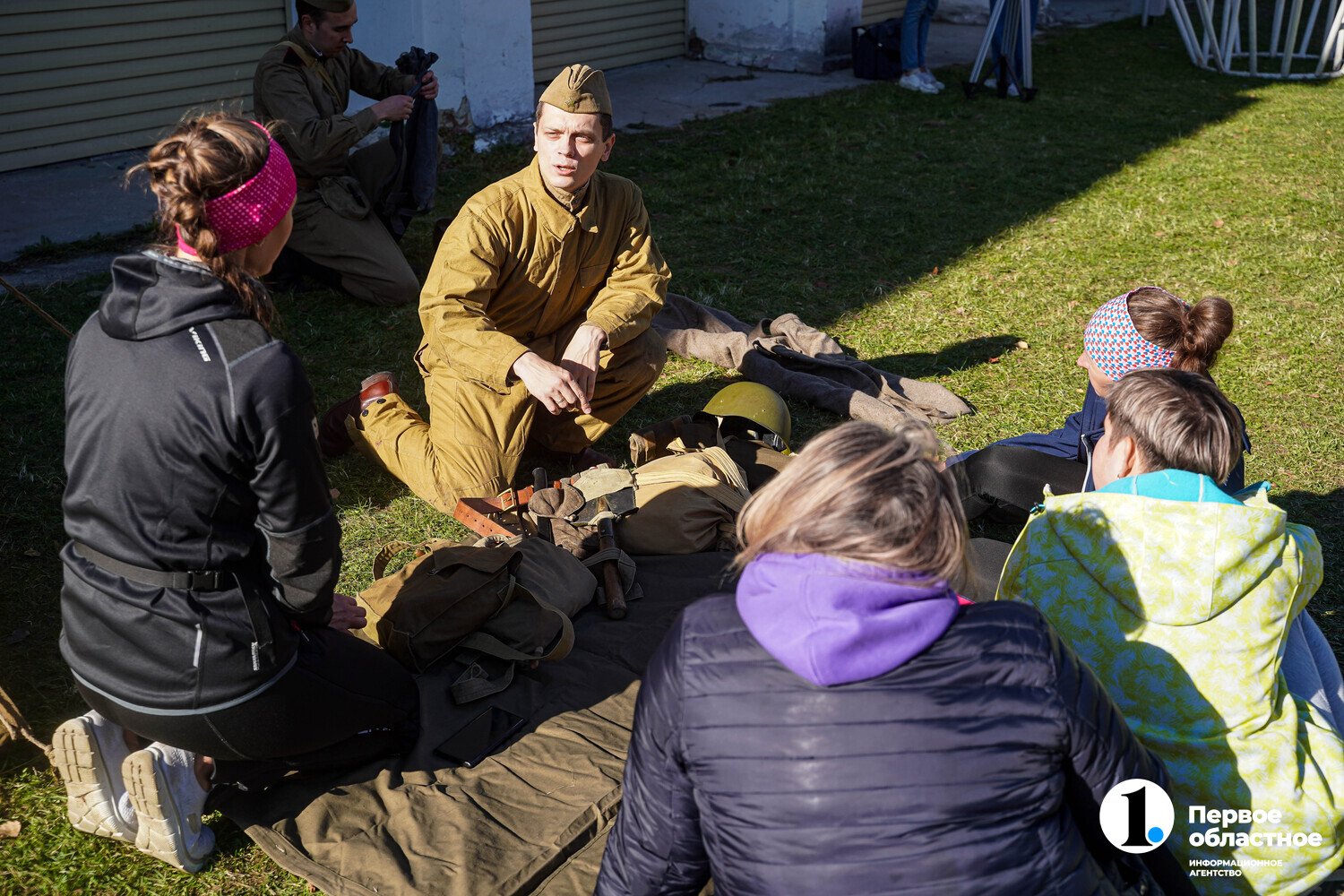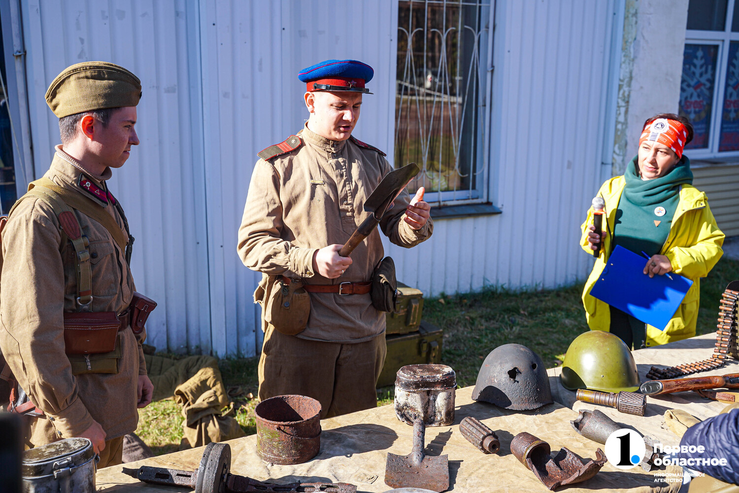Большой интерес у гостей мероприятия вызвала выставка вооружения и техники от военно-исторического клуба «Дивизион». Его сотрудники Данила Пестеров и Илья Чирков рассказали о том, из чего состояло обмундирование советского солдата в годы войны.