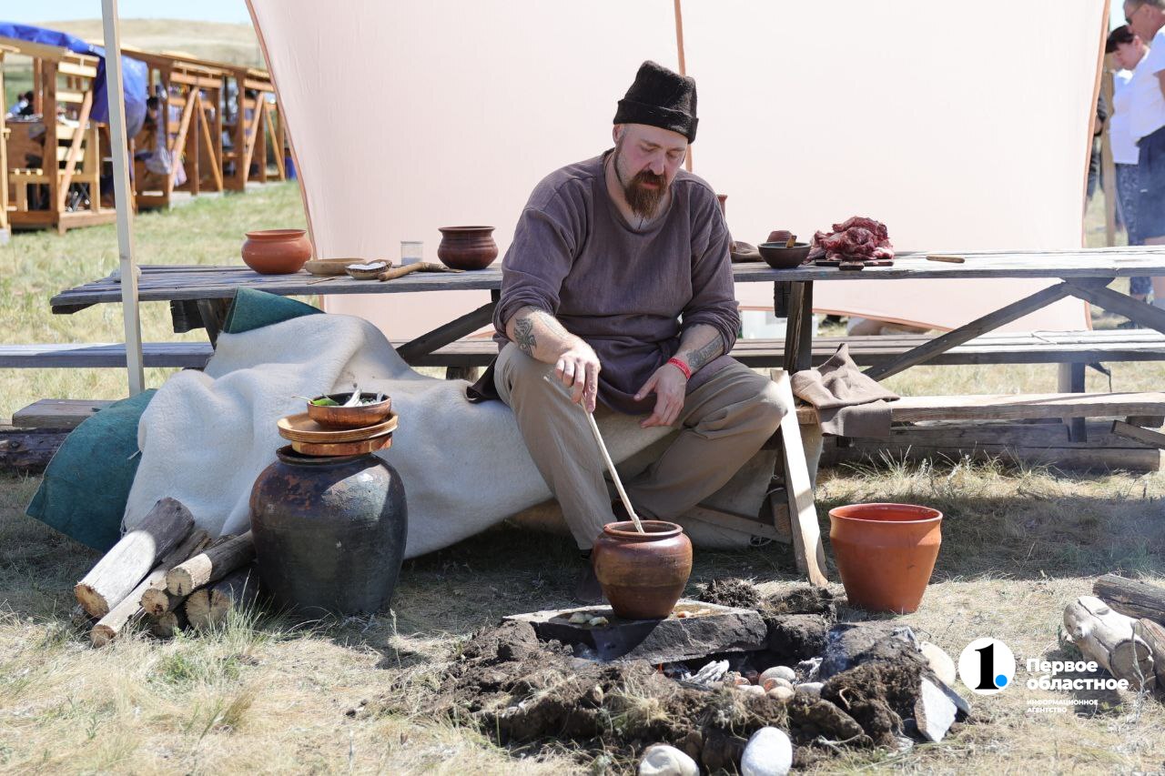 После торжественного открытия начался парад участников в костюмах. На демонстрационной площадке реконструктор готовил козий сыр по уральскому рецепту. Перемешивал ингредиенты в горшке и варил на открытом огне.