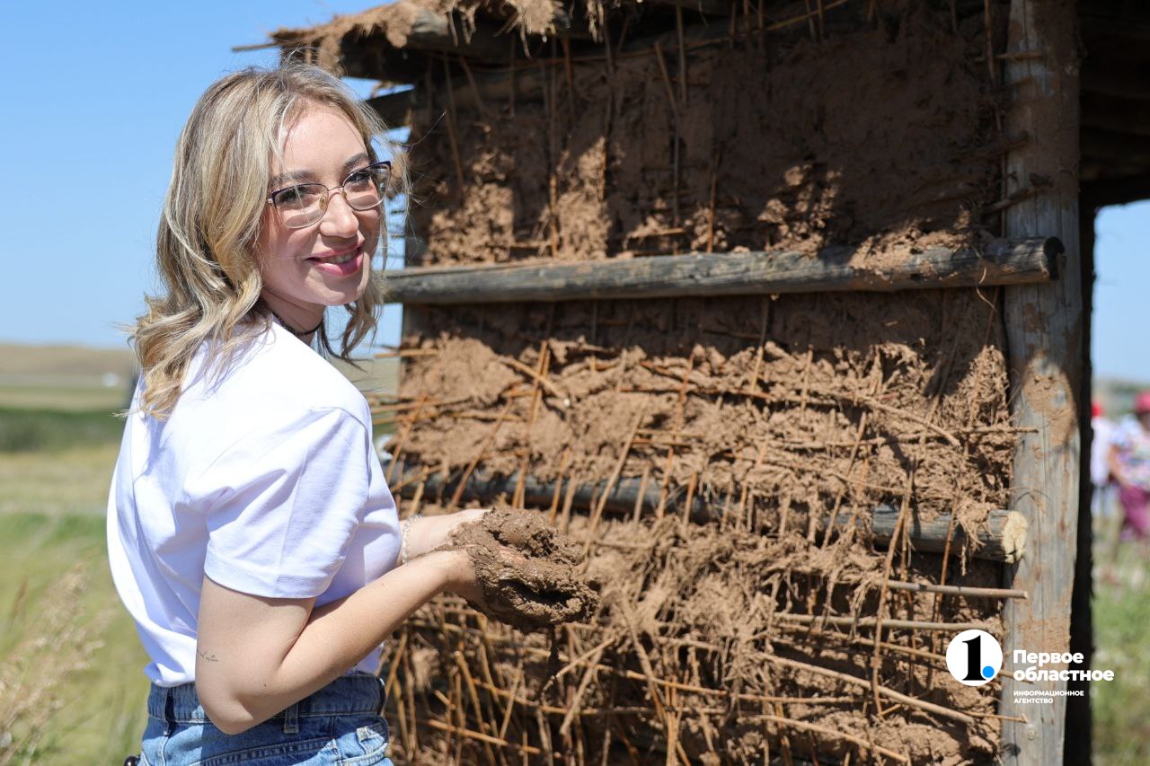 На экспериментальной археологической площадке гости строили дом-мазанку, руками намазывали глину.