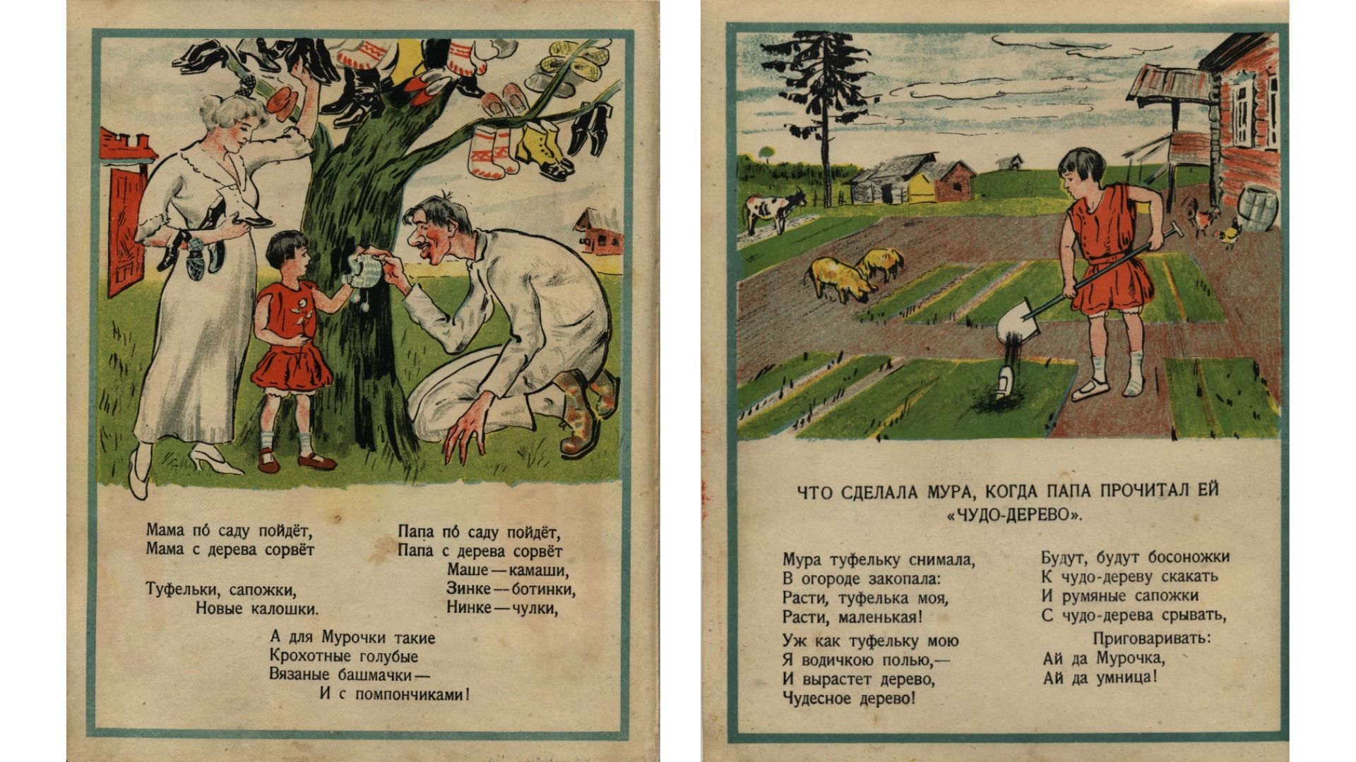 Создатели постановки полностью воссоздали образ Марии из «Муркиной книги» 1925 года издания. Будто на тебя смотрят иллюстрации Лаховского — то же красное платьице Муры, та же прическа, то же чудо-дерево с башмаками вместо листвы. И мама с папой в книжке такие, будто с актеров Молодежного театра писали.