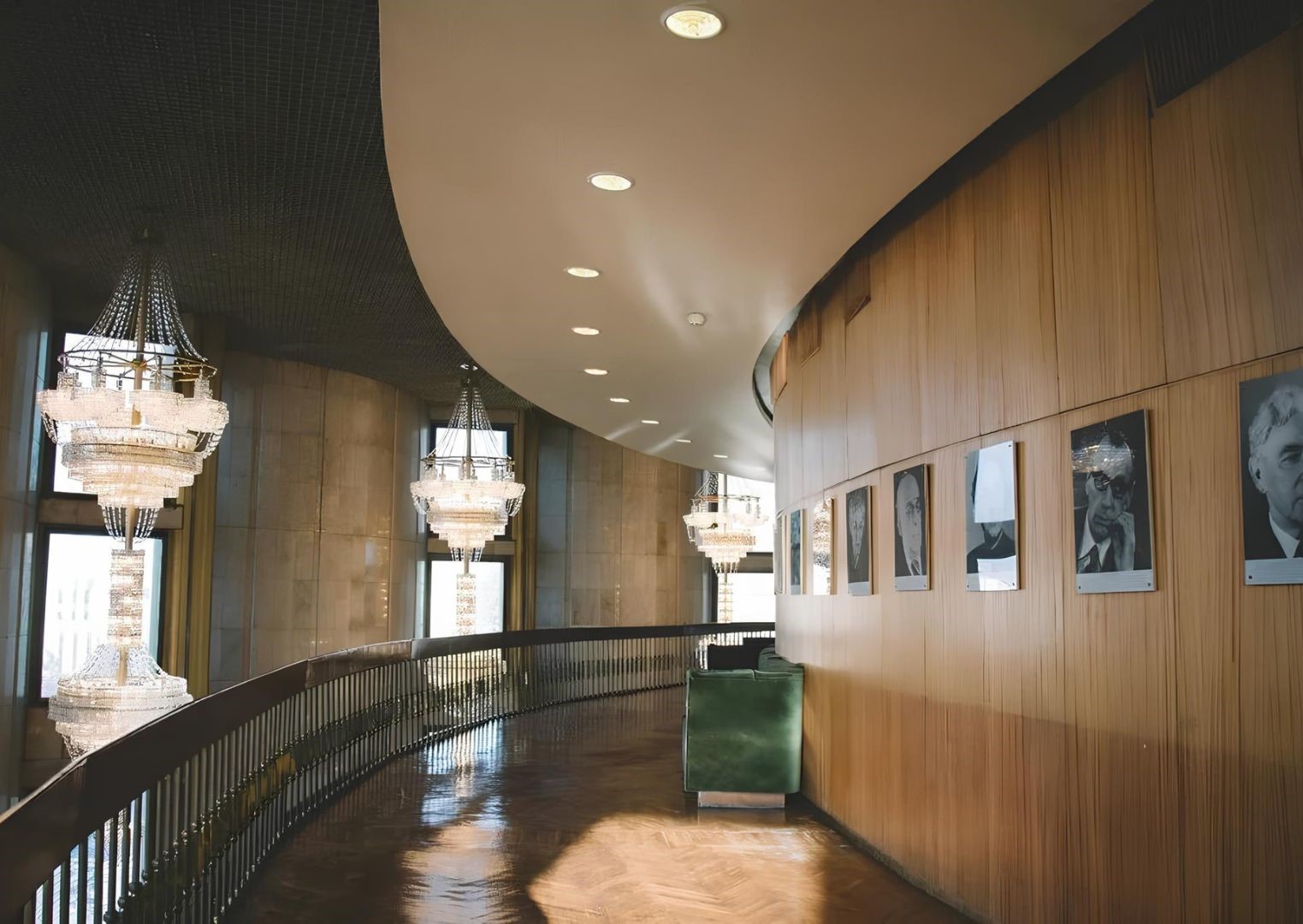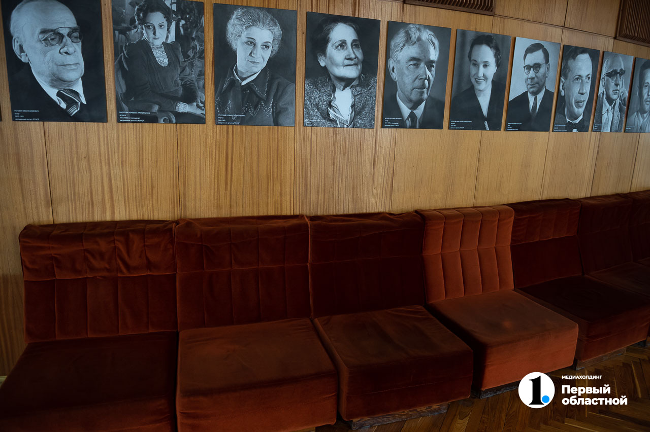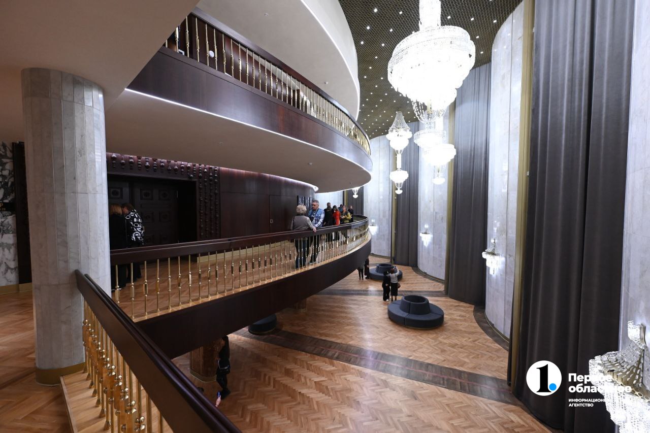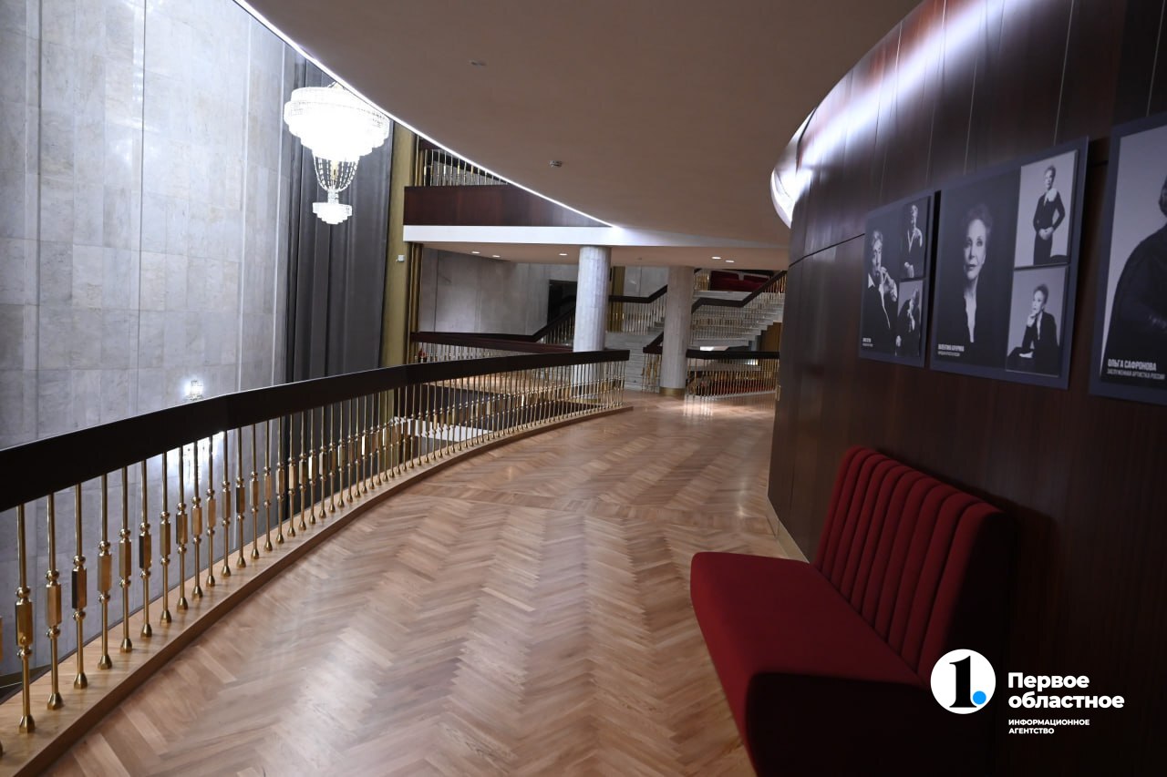 В холлах и рекреациях обновили стены. Со светло-коричневых панели сменились на цвет ярко-красного дерева — идеально в тон перилам, массивным дверям, ведущим в зрительный зал, и новым креслам. К слову, все это тоже отреставрировали: деревянные детали стали темнее и «глубже» по цвету, а балясины засверкали золотом.