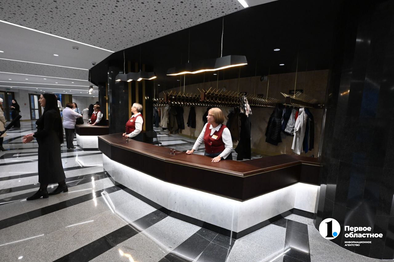 Начнем сразу с главного входа и первого, что видит зритель, — гардероба. Тут поменяли стойку, повесили новые современные лампы. Для работников гардероба сделали теплый пол — холодный мрамор больше не страшен.