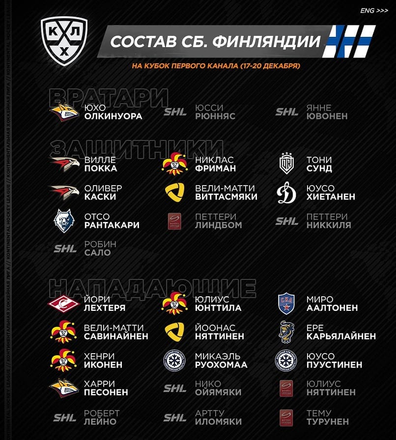 Ранее, 7 декабря, был опубликован состав сборной Финляндии. «Суоми» на московском турнире представят два игрока «Металлурга» — вратарь Юхо Олкинуора и нападающий Харри Песонен.