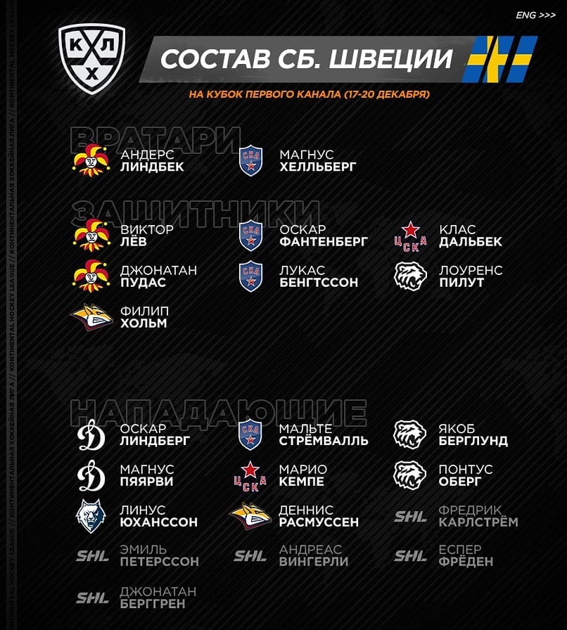 Ещё одна сборная Кубка Первого канала, в которой заявлены игроки «сталеваров» и «чёрно-белых», — команда Швеции. Здесь перевес по хоккеистам в пользу «Трактора», из состава челябинцев вызвано сразу три игрока — нападающие Понтус Оберг и Якоб Берглунд, а также защитник Лоуренс Пилут. «Металлург» представлен в заявке форвардом Деннисом Расмуссеном и игроком обороны Филипом Хольмом.