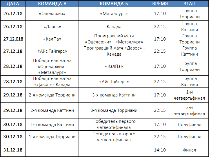Команды разделены на две группы, Торриани и Каттини, которые названы так в честь знаменитых европейских хоккеистов прошлого века. Магнитогорцы сыграют в группе Торриани с «КалПа» и «Оцеларжи».