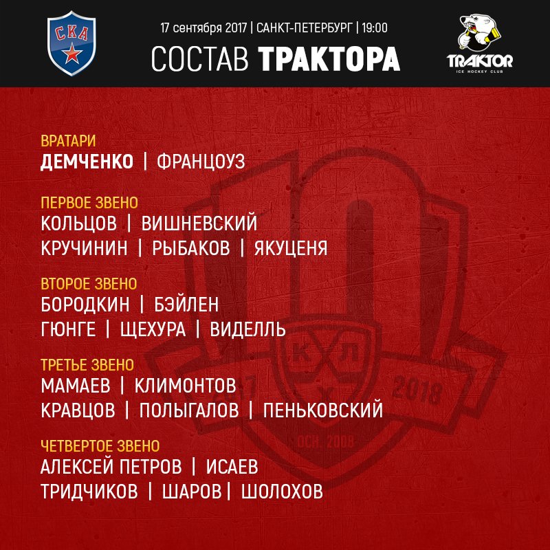Добрый вечер, уважаемые любители хоккея! Сегодня челябинский "Трактор" гостит на берегах Невы. Соперник – действующий обладатель Кубка Гагарина, непобедимый в этом сезоне СКА. На старте подопечные Олега Знарка одержали 11 побед в 11 матчах и набрали 30 очков.
