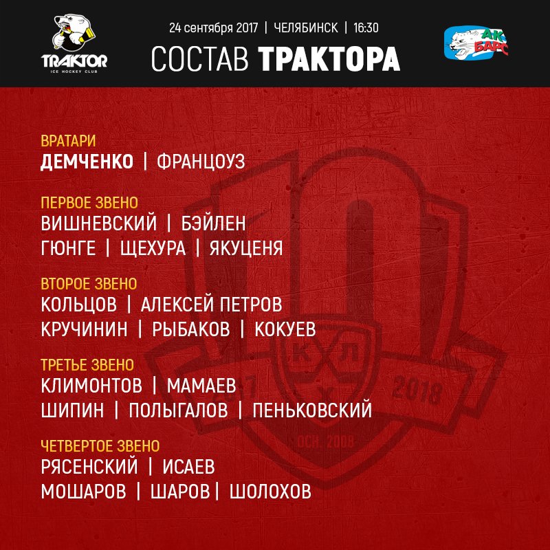 Добрый день, уважаемые болельщики и любители хоккея! Сегодня в Челябинске "Трактор" принимает грозного гостя из Казани. "Ак Барс" хорошо начал юбилейный сезон КХЛ и возглавляет турнирную таблицу Восточной конференции. У подопечных Зинэтулы Билялетдинова 27 очков. Большой вклад в результат вносят новички команды – Андрей Марков и Антон Ландер, них по 11 набранных очков. А у "Трактора" дела значительно хуже, сегодня челябинцы в положении андердога, но прерывать серию поражений нужно. И чем скорее, тем лучше. Подробнее о предматчевых раскладах читайте в анонсе матча "Трактор" – "Ак Барс".