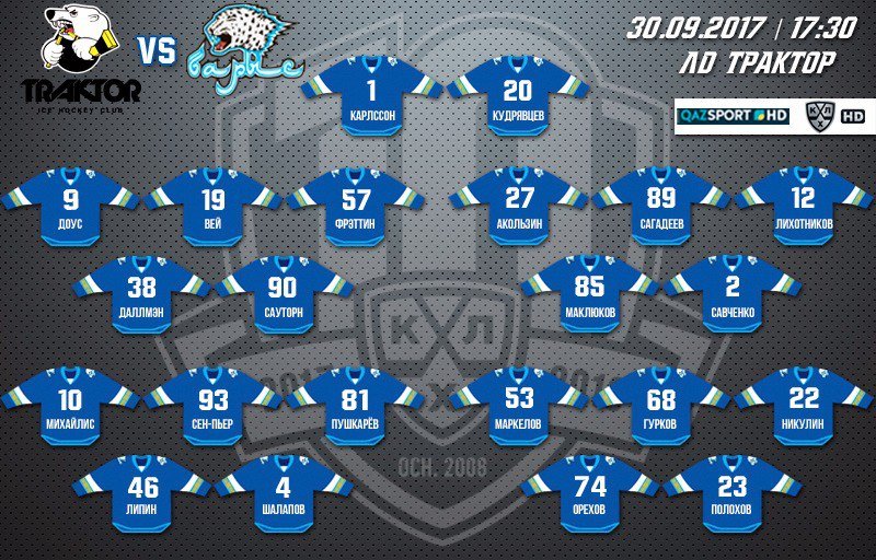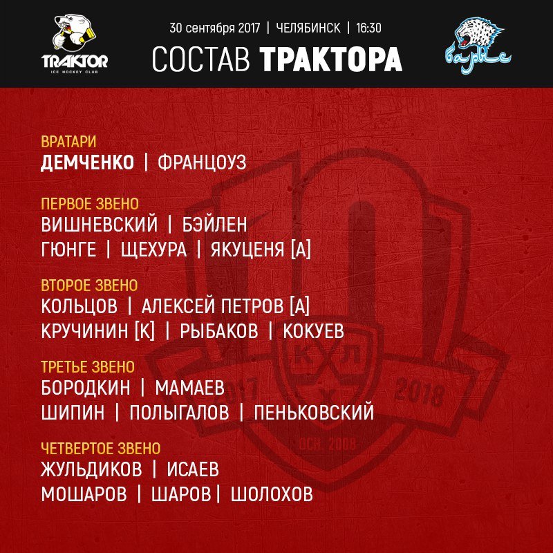 Тренерский штаб «Трактора» выбрал следующий состав на матч против «Барыс». Изменений по сравнению с предыдущей игрой немного, вместо Евгения Рясенского на лед выйдет Никита Жульдиков.
