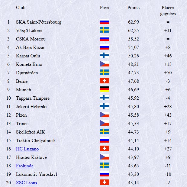 Всего в топ вошло 30 российских команд. Первым остается питерский СКА, на третьем месте — московское ЦСКА. Обладатель Кубка Гагарина прошлого сезона — казанский «Ак Барс», находится на четвертом месте. Магнитогорский «Металлург» — на 28 строчке.