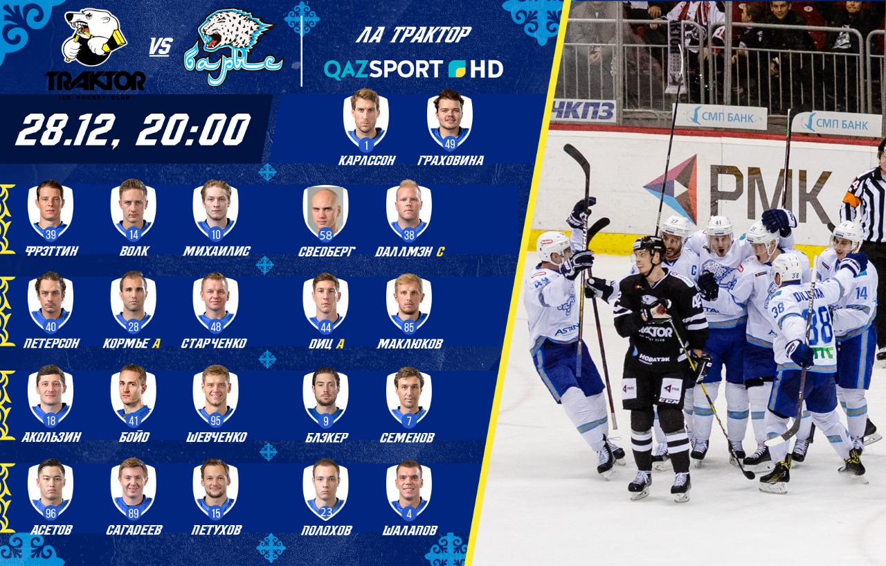 Добрый вечер, уважаемы любители хоккея! Сегодня, 28 декабря, «Трактор», в Челябинске, сыграет с «Барысом» из Астаны. Для комнад эта встреча станет четвертой в этом году. Прошлые матчи не оставляли болельщиков равнодушными. В них было все — зрелищный хоккей, столкновения и спорные решения судей. Будем надеяться, что и эта игра не будет скучной.
