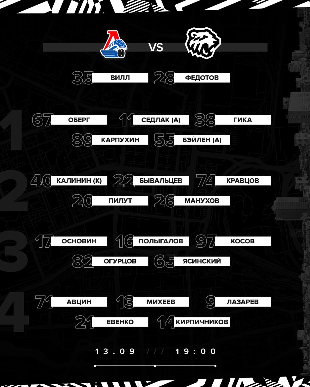 Составы-составчики. Обратим ваше внимание на третье звено, сегодня там, в компании Вячеслава Основина и Игоря Полыгалова, играет Ярослав Косов. Ну и на воротах снова Роман Вилл.
