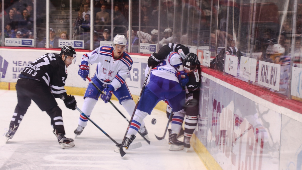 5 мин — СКА в позиционной атаке. Прострельный пас, но перехватывает его защитник челябинцев, отправляясь вместе с шайбой в зону «армейцев».