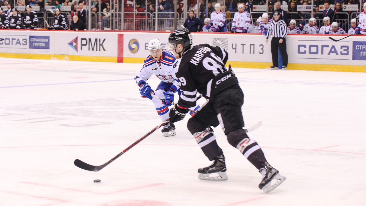 45 мин — Атака СКА. Наиль Якупов делал пас на партнера, Григорий Желдаков вовремя подставил клюшку под передачу.