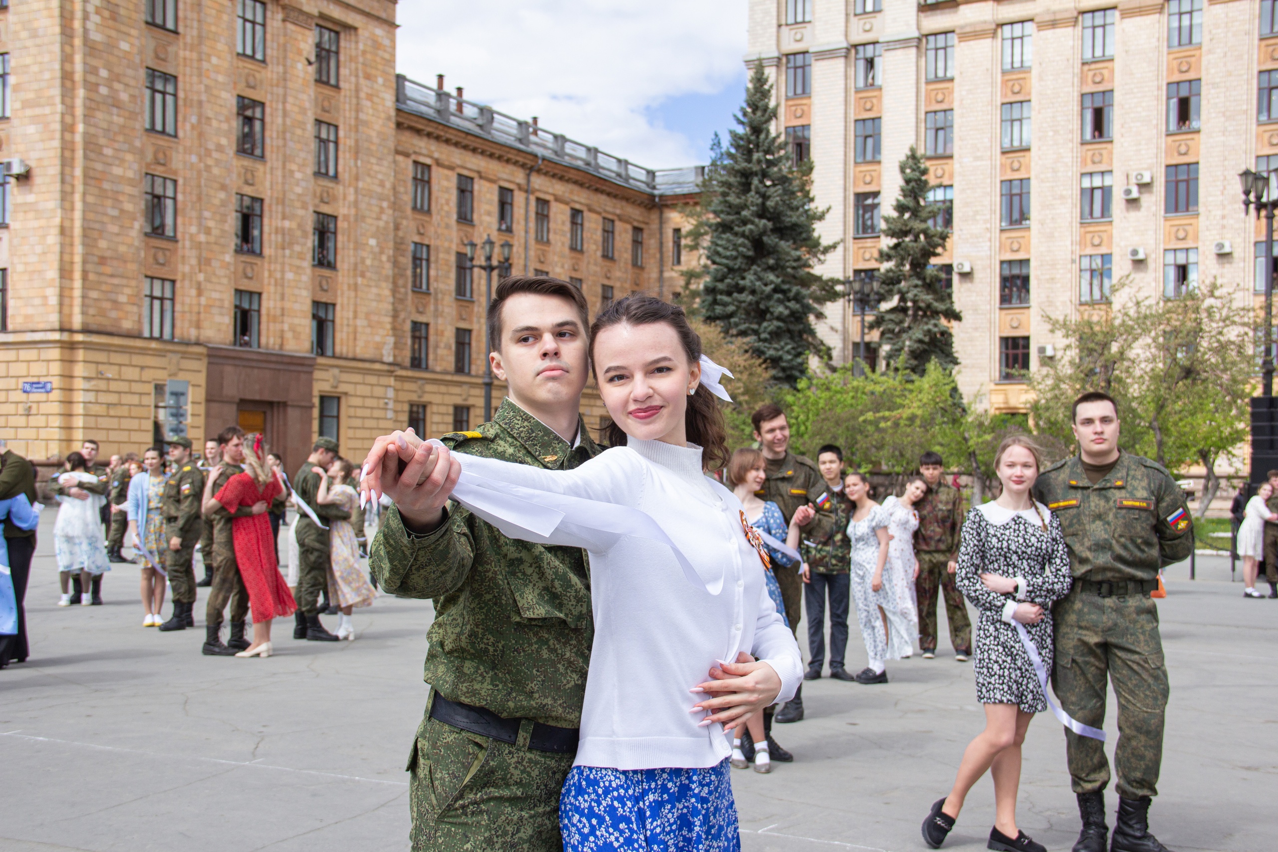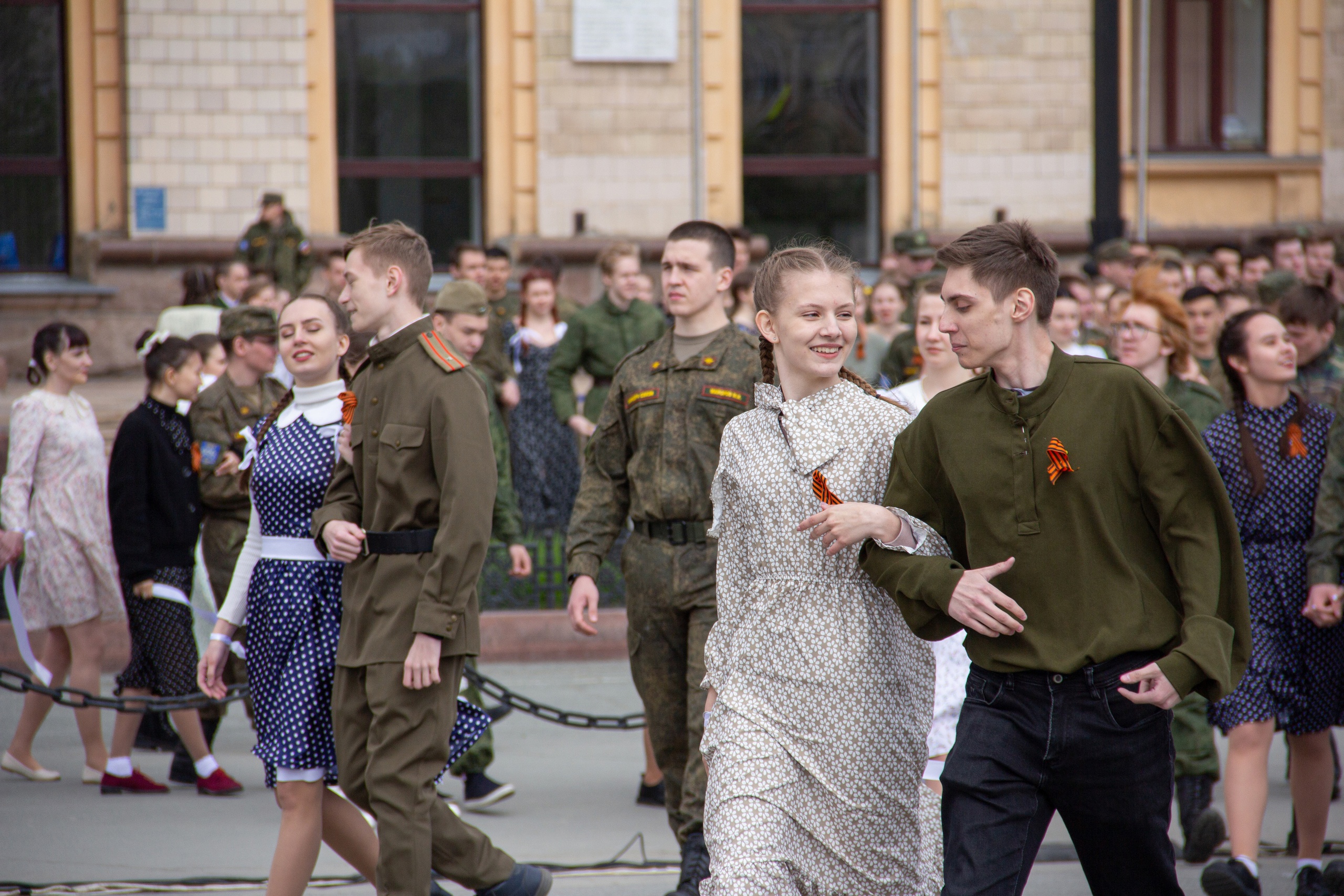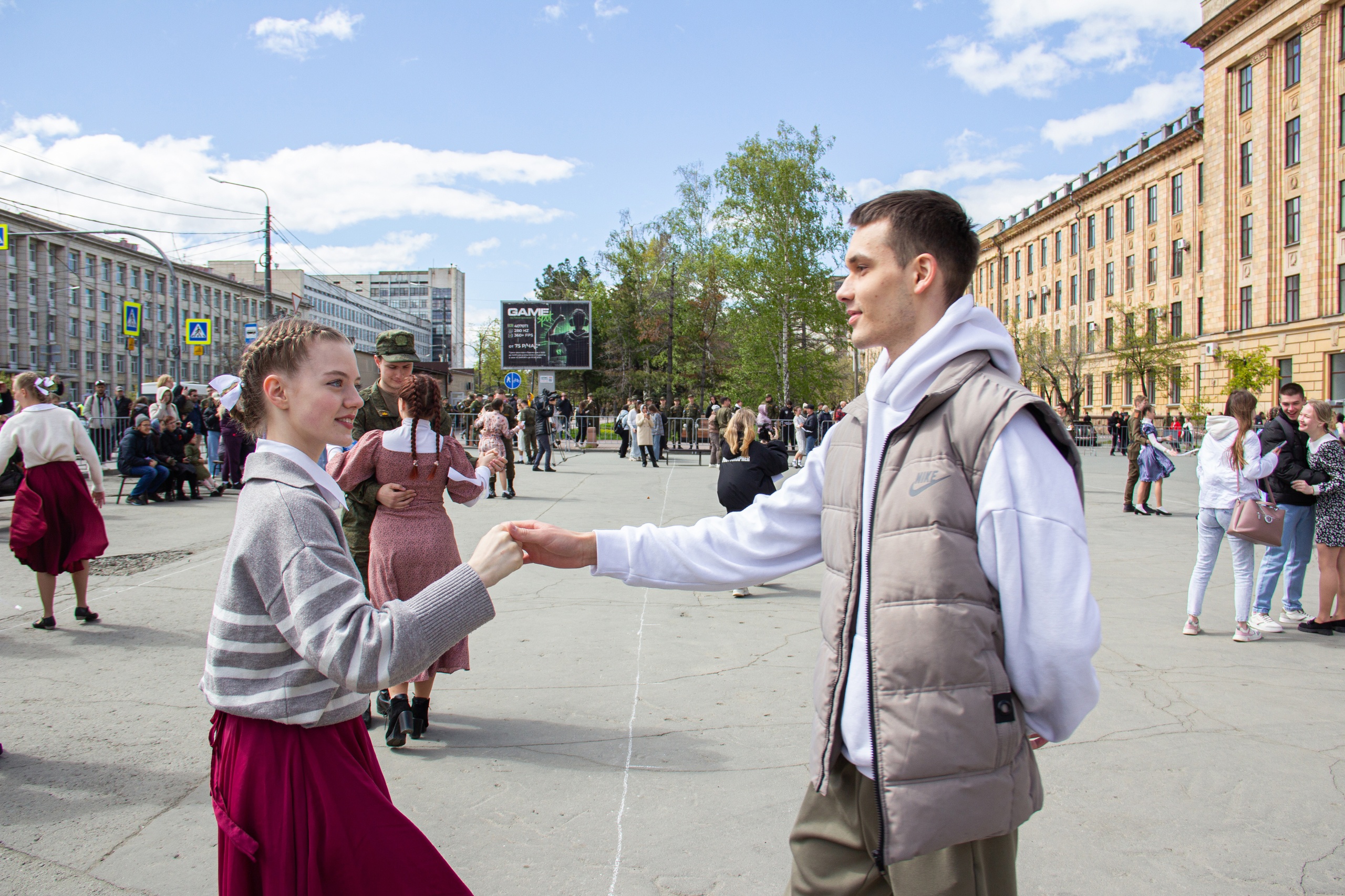 На площади перед главным корпусом ЮУрГУ провели традиционную акцию «Вальс Победы». Почти 500 студентов из вузов, колледжей и техникумов Челябинска закружились в красивом и нежном танце, будто живой калейдоскоп.