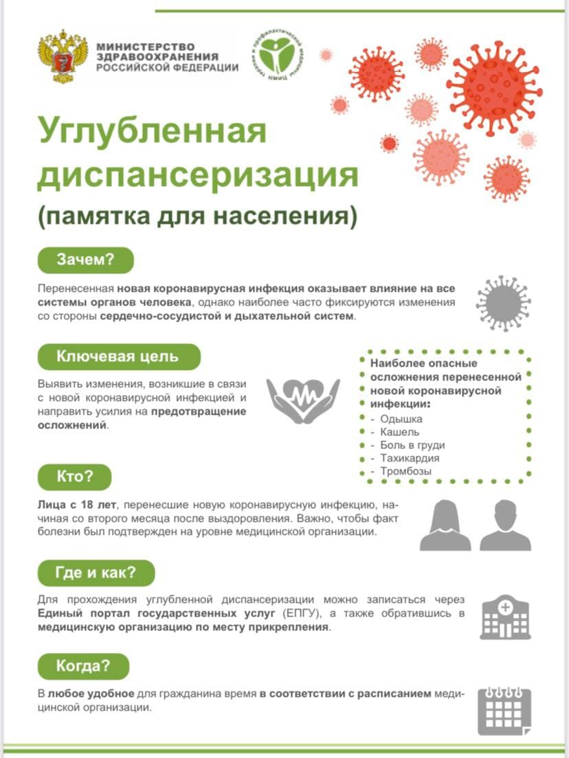 «Минздрав России рекомендует проходить углубленную диспансеризацию не раньше чем через два месяца после болезни. Причем углубленное обследование могут пройти даже те, кому диагноз не выставляли официально, — кто только подозревает, что болел ковидом. Обратиться к медикам могут даже те пациенты, кто уже проходил диспансеризацию в этом году. Такие люди имеют право обратиться к медикам повторно и сдать дополнительные анализы», — говорит пресс-секретарь центра медпрофилактики Василиса Кузнецова.