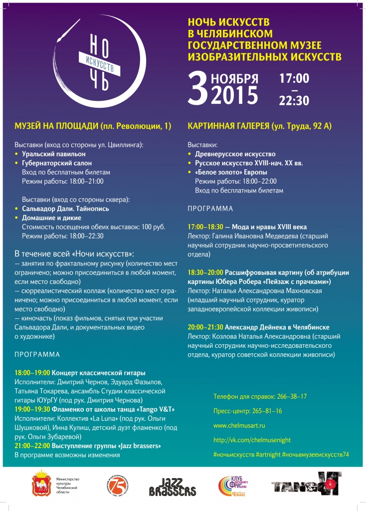 В музеях разных южноуральских городов праздник искусства будет иметь разный оттенок. В Сатке сделают упор на знакомство горожан с историей архитектуры через экскурсии, квесты и концерты. В Агаповском районе внимание акцентируют на процессе изготовления поделок, Магнитогорск отдаст дань памяти Александру Пушкину и устроит концерт с фрагментами «Капитанской дочки» и «Евгения Онегина». Челябинск встретит «Ночь искусств» силами двух музеев. Музей изобразительных искусств пригласит на выставку Сальвадора Дали. В Челябинском краеведческом музее откроют целый фестиваль современного искусства.