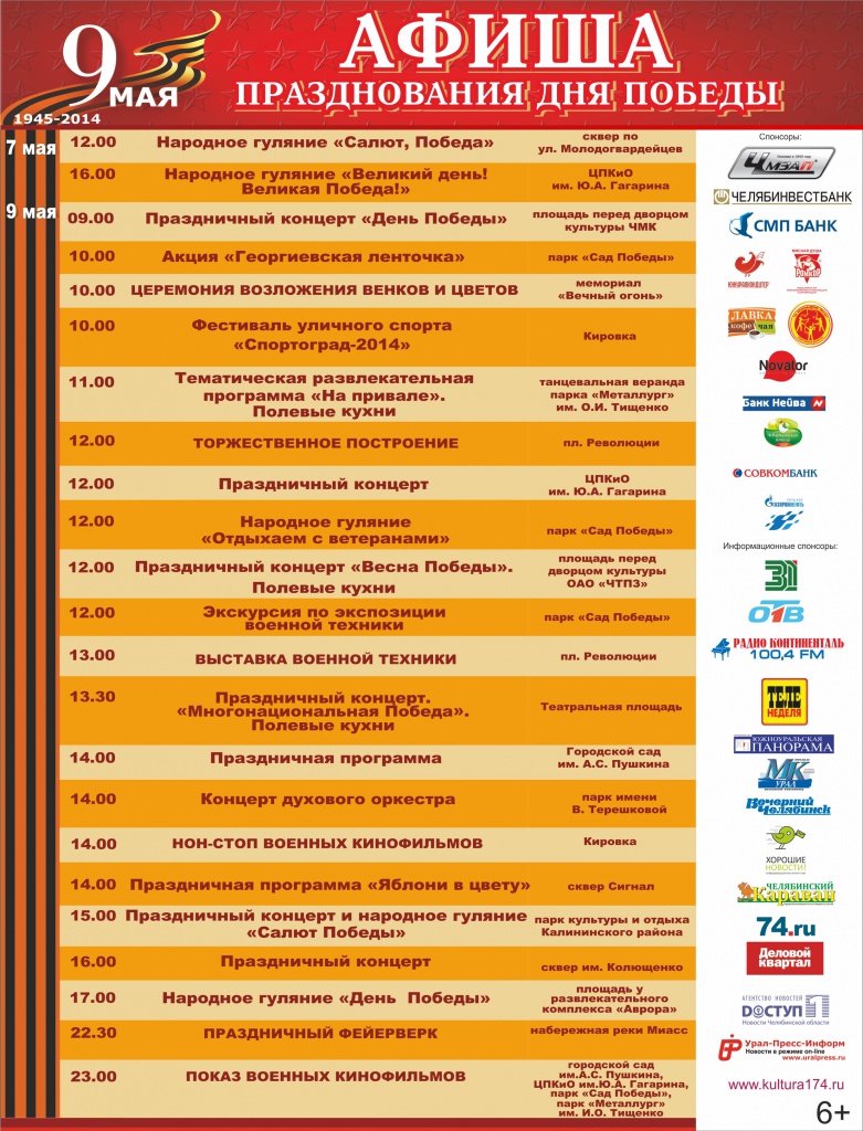 9:00 — праздничный концерт «День Победы (площадь перед дворцом культуры ЧМК);