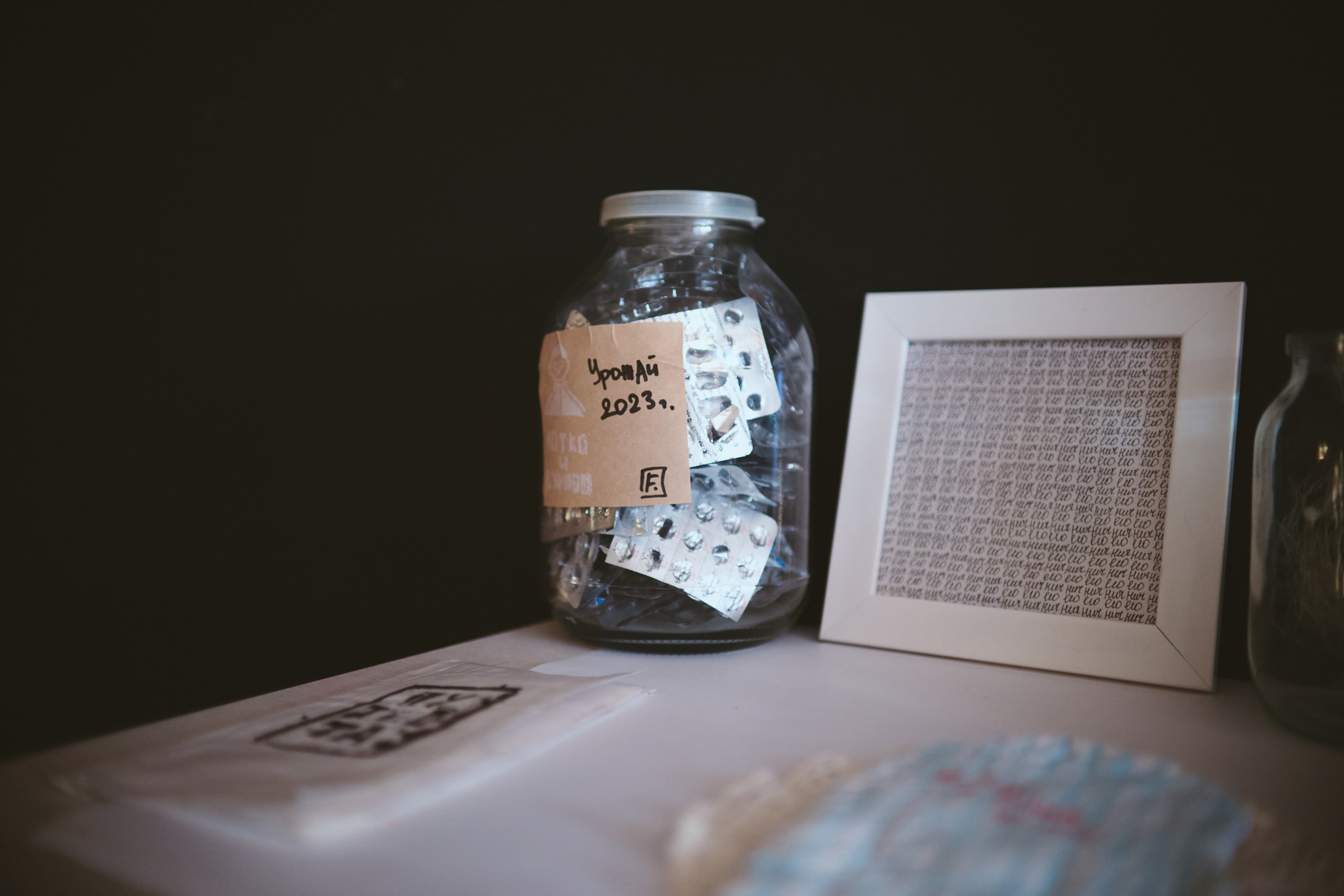 На полу — яркий ковер, у окна — мольберт. На подоконнике — трехлитровка с надписью «Урожай 2023 г.» и пустыми блистерами от таблеток, спасающих от головной боли, изжоги, простуды. Есть здесь и свои разбойники: три кота — Мацумото, Васио и Масяня.