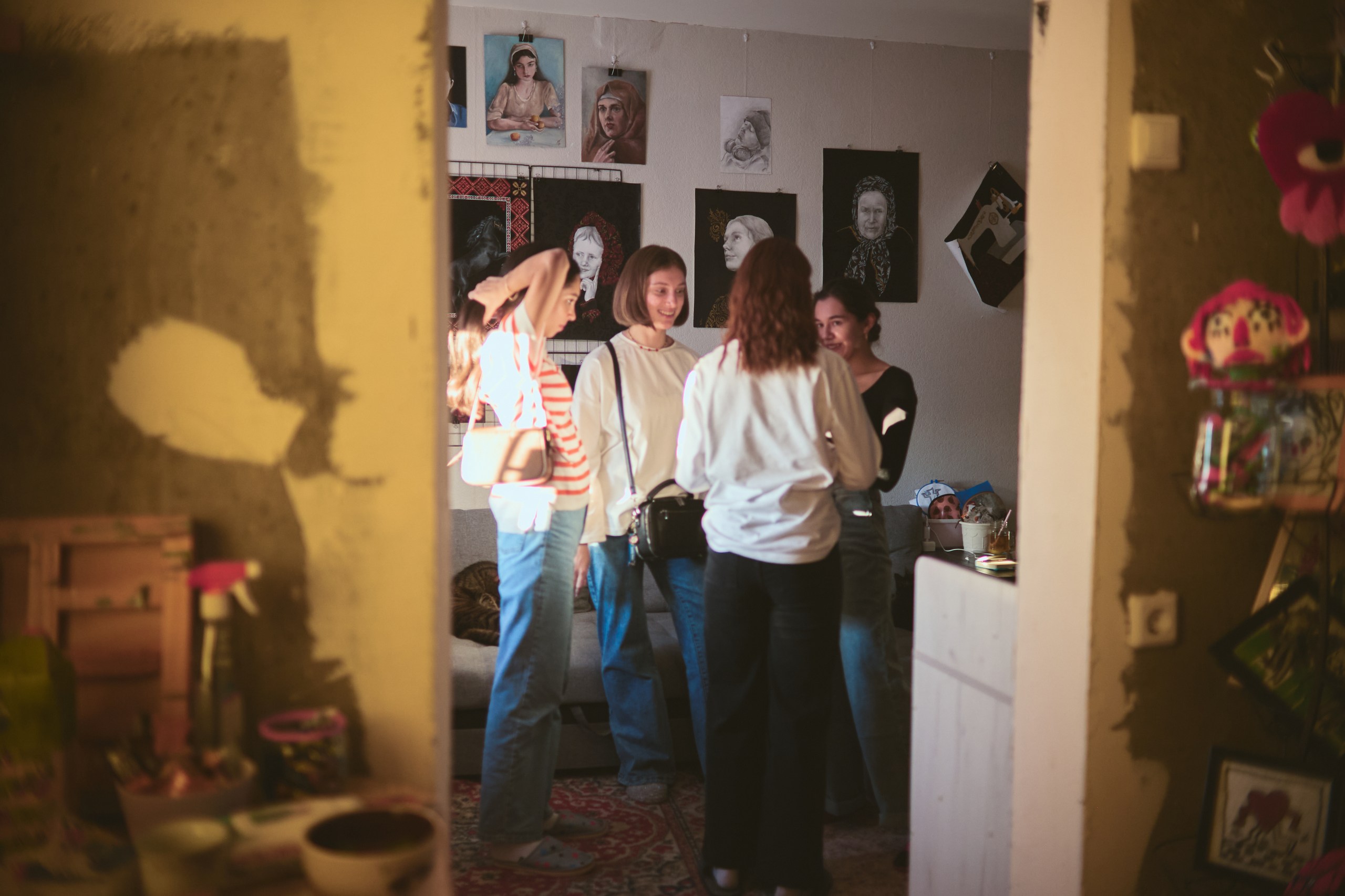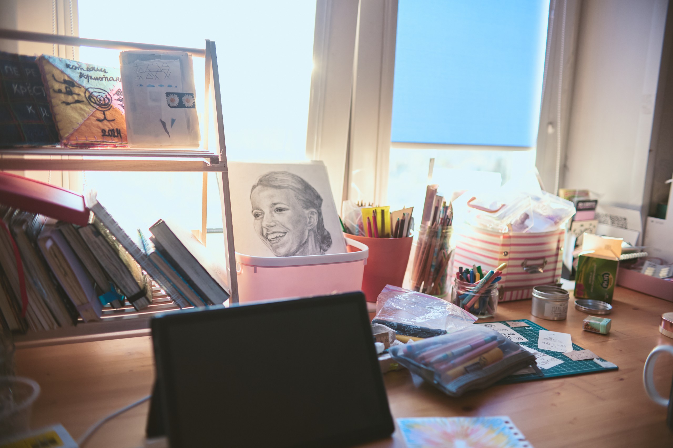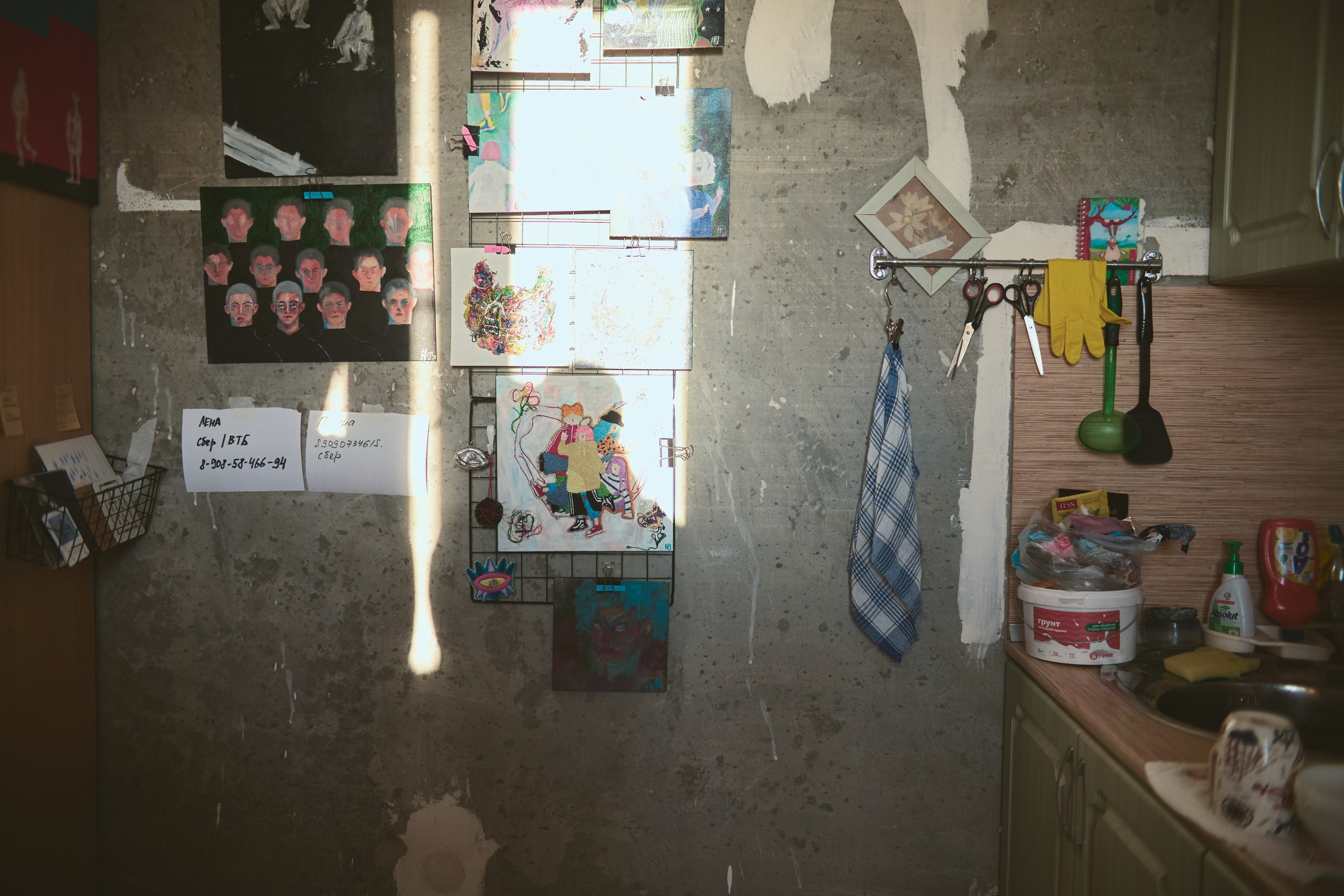 Здесь я не смогла побывать, но Полину знаю давно — учились в одном вузе, я возлагала на нее часть своих полномочий главы медиацентра. Мастерская художниц — самая, я бы так сказала, квартиральная квартиральня. Это небольшая квартирка на краю Чурилово, увешенная скетчами, рисунками и открытками. Место, которое представляешь под словами «там, где живут художники».