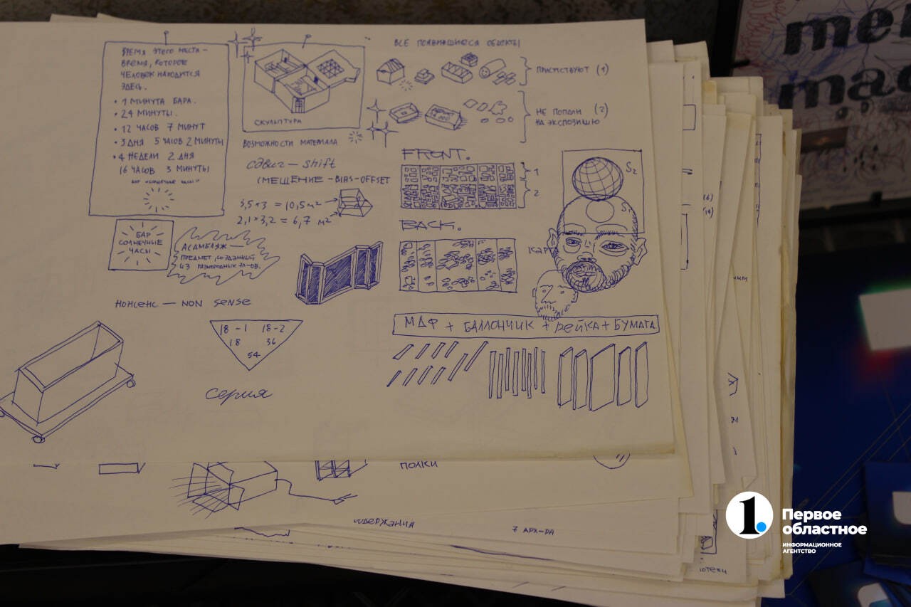 В мастерской настоящий художественный беспорядок: открытые исписанные тетради с перечеркнутыми строчками, стакан с покрасневшей от красок водой, книги по современному искусству, схемы, картины. Крекеры.