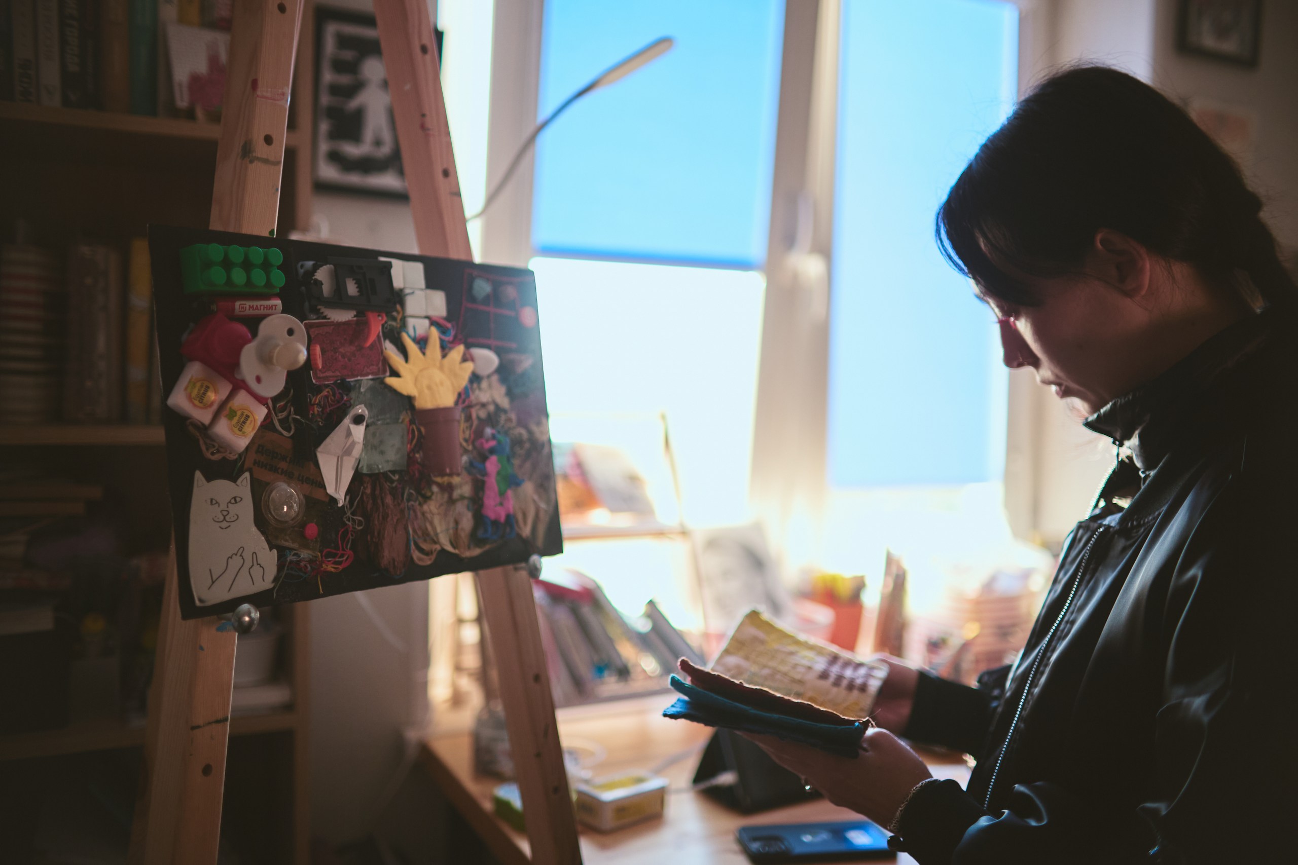 «Хочу показать закулисье нашего ремесла, чтобы люди видели не просто выставочное пространство, а то место, где все создается, где находятся какие-то смыслы. Я тут очень много просто стою и думаю: „Да боже мой, ничего не получается!“ А потом через два часа приходит идея. И я стараюсь свое пространство как-то украшать, оно, мне кажется, получается достаточно творческое, вдохновляющее. Пусть люди просто придут и посмотрят. Не многие же бывают в художественных мастерских», — рассказывает Анастасия.