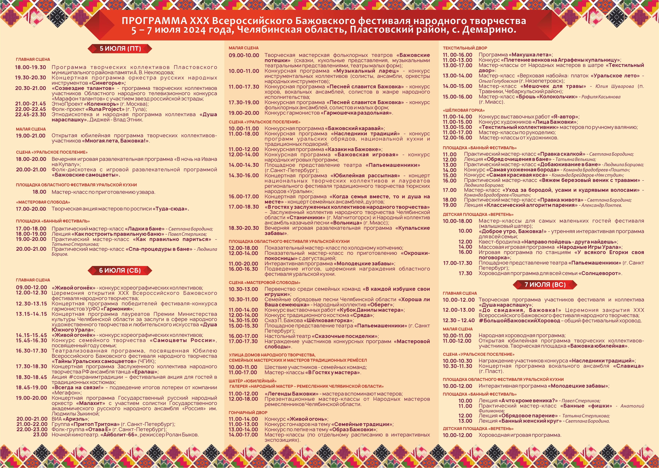 Вблизи села Демарино Пластовского района вскоре соберутся мастера-ремесленники, артисты-народники, фольклористы и любители исконного творчества со всей России. Все потому, что с 5 по 7 июля здесь пройдет традиционный народный Бажовский фестиваль. Как поделились организаторы, в этом году участников ждут новые площадки, конкурсы и даже мини-салон от уральских брадобреев.