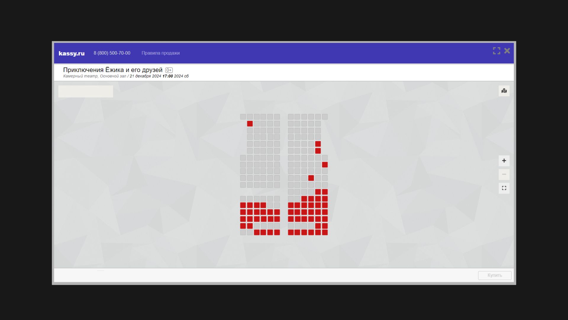 Так, к слову, на все пять прогонов «Волшебных часов». А что там с «Ежиком»? Мы нашли только три показа из четырнадцати, где билеты еще остались. Но залы выглядят примерно так: